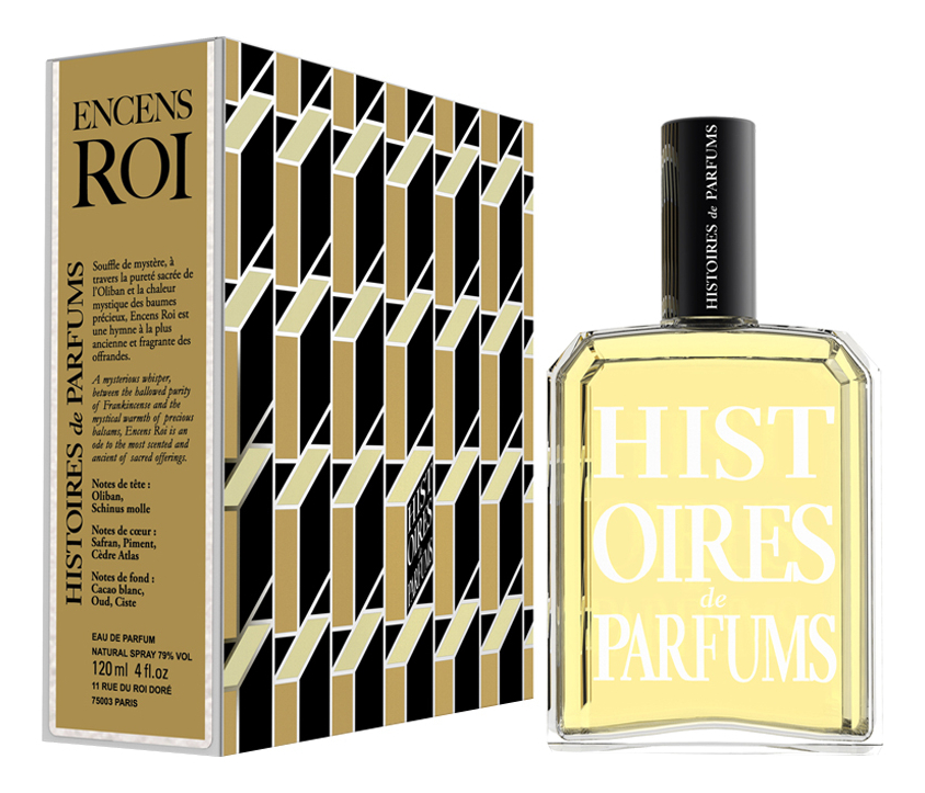 Histoires de Parfums Encens Roi — древесно-пряный аромат для мужчин и женщин, представленный публике в 2022 году. Под фруктовыми и травянистыми лучами римской ромашки пикантное сияние ладана встречается с древесной и почти соленой свежестью розового перца. Такой союз вызывает в памяти образ потрескивающей на солнце коры, разливающей в воздухе аромат благовоний и смол. Вдохновленный бодрящими нотами атласского кедра запах пряного шафрана пробуждает благоухание кожи и табака, погружает в тайные глубины уда и гурманскую сладость белого какао.Histoires de Parfums Encens Roi можно назвать мистическим переплетением сладкого и холодного дыма. Мистический аромат предлагает сделать шаг, выбрав для себя путь удовольствий или просветления.