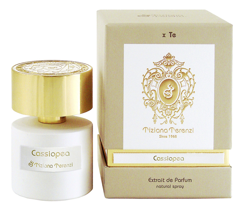 Cassiopea – мягкий, обволакивающий и таинственный по звучанию цветочно-фруктовый унисекс парфюм, выпущенный в 2015 году итальянским нишевым парфюмерным домом Tiziana Terenzi в рамках новой «Лунной коллекции» ароматов.Композиция Тициана Терензи Кассиопея вдохновлена звездным небом и удивительной красотой созвездия Кассиопеи. Еще одним вдохновением для создания аромата послужила древнегреческая легенда о Кассиопее, которая и дала название созвездию.Парфюм начинает звучание с тонкого, чуть терпковатого запаха черной смородины, пряной сладости маракуйи и цитрусовой прохлады лимона. Сердце композиции дарит трогательный аромат ландыша, шелковисто-пряный запах розы и яркую пряность цветущей гвоздики. В то время как база композиции из бархатисто-сливочного сандала, сладковато-дымных бобов тонка и теплого и бархатистого мускуса формирует мягкий ароматический шлейф, элегантно завершающий звучание парфюма.
