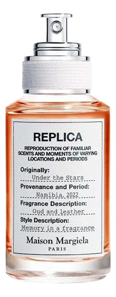 Maison Martin Margiela Replica Under The Stars — восточно-древесный унисекс-парфюм, выпущенный в 2023 году французским брендом Maison Martin Margiela в рамках парфюмерной коллекции Replica. Парфюм приглашает в западную Африку, в Намибию, предлагая отдохнуть под заполненным искрящимися звездами ночным небом. Он рисует умиротворяющую картину потрескивающего костра под завораживающим гобеленом звёздного неба. Навеянный чудесной ночью под открытым небом аромат, призван согревать и очаровывать, подобно огню и созвездиям.Under the Stars (Под звездами) — это приключение и место спокойствия среди дикой природы, с нотами сухого и пряного черного перца, которые уступают место хвойно-дымному кедровому сердцу. Волшебный вечер продолжается в базе согревающими объятиями лабданума, чувственной кожи и священного дерева агар. Аромат пробуждает волшебство ночной дикой африканской природы и очаровывает мистической аурой сияющего звездами бездонного ночного неба.
