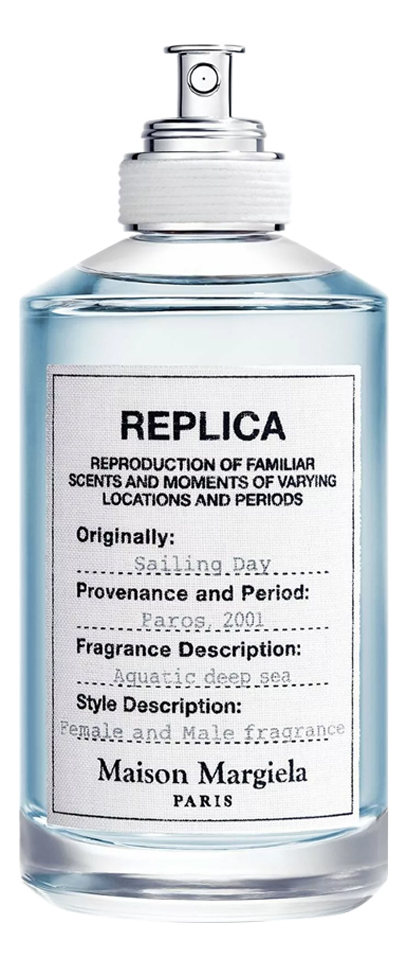 Sailing Day - новая элитная туалетная вода с древесным пряным ароматом для женщин и мужчин из парфюмерной серии Replica французского модного дома Maison Martin Margiela, представленная в сентябре 2017 года. Аромат Sailing Day словно прыжок двух влюбленных в морскую пучину страстей и желаний, который заставляет покорять могучие водные пространства, пронзенные солнечными лучами, с терпким соленым привкусом на губах.Чувственный, страстный аромат открывается хвойными "джиновыми" оттенками можжевельника, теплыми пряными специями красного перца и огненного чили на прохладном свежем фоне морских нот и альдегидов. Строгий дымный запах ириса и бархатисто-медовой розы, пряного кориандра и соленый привкус морских водорослей насыщают средние ноты композиции, гармонично переплетаются со шлейфом парфюма Maison Martin Margiela Sailing Day наполненного древесно-бальзамическими оттенками и тонким ароматом серой амбры.