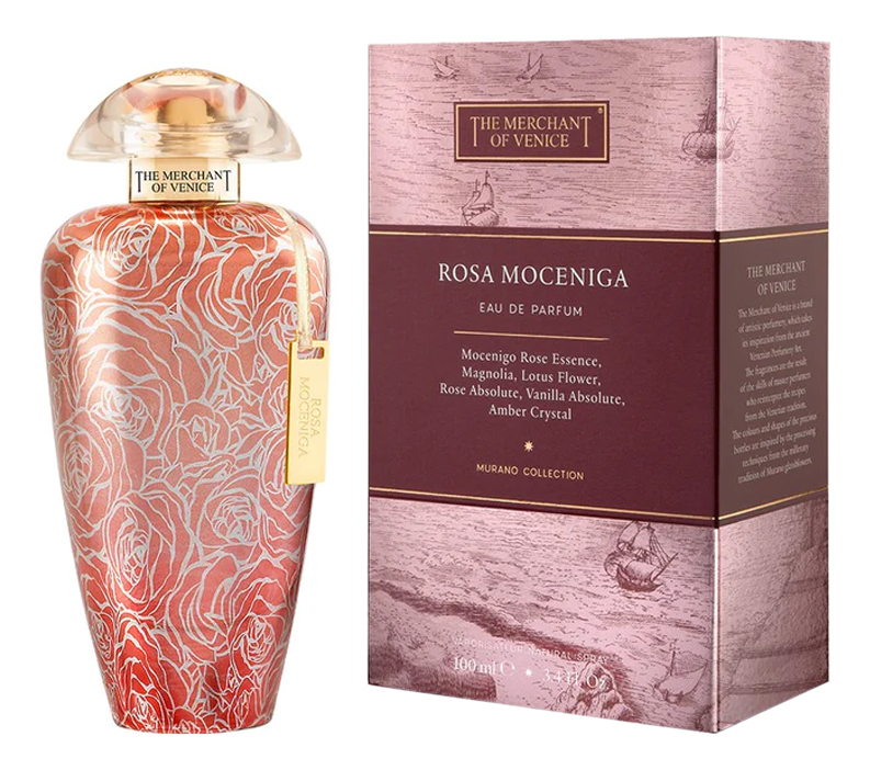 Rosa Moceniga – яркий, кокетливый и просто очаровательный женский цветочный парфюм, выпущенный в 2016 году итальянским нишевым парфюмерным домом The Merchant Of Venice в рамках коллекции «Мурано».Роза Мочениго – старинный сорт розы, который пришел в Европу с равнин Центрального Китая. Постепенно он стал диким в венецианской сельской местности, но серебристо-розовые лепестки и тонкий аромат с легкими фруктовыми нюансами по-прежнему напоминают богатые и экзотические земли ее далекой родины. Пришедшая из Китая роза получила название старинной венецианской семьи Мочениго, которая до сих пор владеет исторической резиденцией в Алвисополи, в течение последних 200 лет знаменитой изысканным розарием. Этой удивительной розе и посвящена ароматическая композиция парфюма.Верхние ноты парфюма соблазняют сицилийской свежестью бергамота и нежным шелковисто-пряным ароматом розы Мочениго, чуть оттененными листьями черной смородины. Букет из пышных цветов, представленный в сердце композиции, во главе с пышным розовым абсолютом, поддержанным свежим ванильно-лимонным ароматом магнолии и прозрачным сладковато-пряным запахом лотоса. Успокаивающий мускус, хвойно-сливочные оттенки белого кедра и нежнейшая сладость ванили с чуть смолистыми акцентами амбры в финальном аккорде обрамляют чудесный аромат розы, придавая ему особые, царственные оттенки звучания.