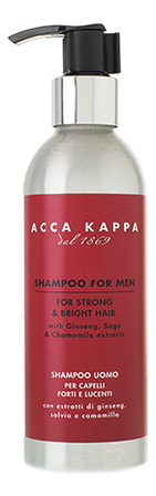 От производителя:Безупречное и деликатное очищение волос и кожи головы от пыли, грязи и излишков кожного жира, увлажнение и тонизирование, антиоксидантное и антивозрастное воздействие, придание волосам послушности и мягкости – все это обеспечивает шампунь для волос от итальянского производителя Acca Kappa.Формула 1869 Shampoo For Men создана специально для мужчин, содержит:- Экстракт женьшеня – обладает увлажняющими, тонизирующими и омолаживающими свойствами;- Экстракт зеленого чая – оказывает антиоксидантное воздействие.Шампунь имеет приятный аромат, сочетающий кардамон и цветочно-древесные нотки, подходит для разных типов волос.Способ применения:Нанести на влажные волосы, помассировать, смыть теплой водой.Состав:Шампунь для волос Acca Kappa 1869 Shampoo For Men содержит: экстракт женьшеня, экстракт зеленого чая, провитамин В5.