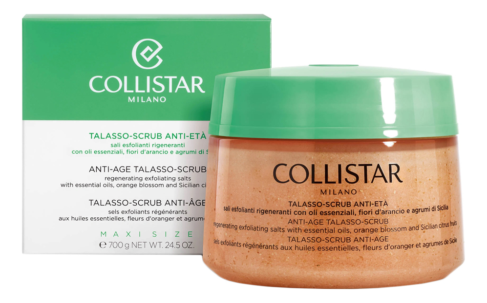 От производителя:Collistar Антивозрастной талассо-скраб для тела Talasso-Scrub Anti-Eta ― средство с эфирными маслами, экстрактами флёрдоранжа и сицилийскими цитрусами сочетает в себе все преимущества талассотерапии. Это средство выполняет четыре различных действия для того, чтобы ваша кожа выглядела здоровой и сияющей.Первое действие — отшелушивание и обновление. Морская соль ускоряет обновление клеток кожи, удаляет омертвевшие частички эпидермиса и придаёт покровам гладкость и мягкость.Второе действие — защита от свободных радикалов и осветление кожи. Сицилийские цитрусовые, богатые альфа-оксикислотами, флавоноидами и витамином С борятся со старением кожи и предотвращают образование пигментных пятен. Это помогает ей выглядеть светлее и свежее.Третье действие — регенерирующее и антивозрастное. Экстракт цветов апельсина содержит флавоноиды и антиоксиданты, которые помогают улучшить цвет кожи и защищают её от преждевременного старения.Четвёртое действие ― восстановление. Цитрусовые эфирные масла и масло флёрдоранжа оказывает бодрящий эффект и усиливает действие остальных активных компонентов.Скраб с эфирными маслами подходит для всех типов кожи и не содержит агрессивных химических веществ.Способ применения:Размешайте скраб в баночке и нанесите на тело массажными движениями. Особое внимание уделите огрубевшим участкам кожи. Смойте водой.При нанесении на влажную кожу скраб действует более деликатно. Для интенсивного отшелушивания его можно использовать на сухой коже. Рекомендуется применять 1–2 раза в неделю.Состав:Collistar Антивозрастной талассо-скраб для тела Talasso-Scrub Anti-Eta содержит: MARIS SAL, CAPRYLIC/CAPRIC TRIGLYCERIDE, ISOPROPYL PALMITATE, CITRUS LIMON PEEL POWDER, JOJOBA OIL/MACADAMIA SEED OIL ESTERS, CITRUS AURANTIUM AMARA FRUIT EXTRACT, PARFUM, ISOPROPYL MYRISTATE, ETHYLHEXYL PALMITATE, TRITICUM VULGARE GERM OIL, SQUALENE, PHYTOSTERYL MACADAMIATE, TOCOPHERYL ACETATE, PHYTOSTEROLS, TOCOPHEROL, BHT, CI 47000, CI 26100, BENZYL SALICYLATE, HEXYL CINNAMAL, LIMONENE, LINALOOL.