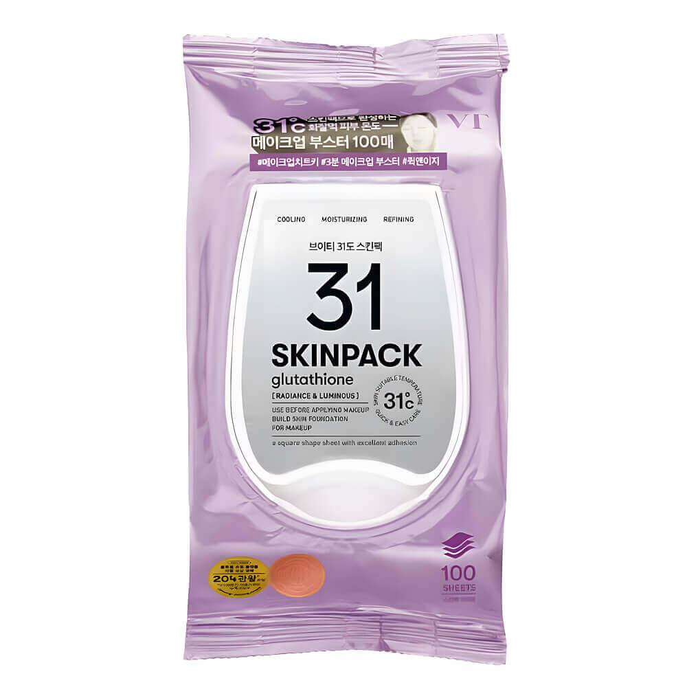 Осветляющие тонер-пэды с глутатионом для подготовки кожи к макияжу VT Cosmetics 31 Luminous Skin Pack оказывают выраженное увлажняющее и успокаивающее действие, охлаждают, выравнивают текстуру, уменьшают покраснение и придают естественное сияние. Содержат глутатион, арбутин, ниацинамид, витамин C, витамин B12, PHA.