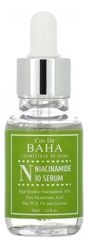 От производителя:Противовоспалительная сыворотка для лица с ниацинамидом Niacinamide 10% Serum от южнокорейского косметического бренда Cos De Baha подходит для жирной, комбинированной и проблемной кожи. Средство борется с прыщами и акне, предотвращает появление воспалений, снимает раздражения, осветляет пигментацию и делает менее выраженными следы от акне. Нормализует выработку кожного жира, матирует кожу, сужает поры, устраняет зуд и шелушения, предотвращает преждевременное старение.Ниацинамид в составе средства восстанавливает эластичность кожи, стимулирует выработку коллагена, улучшает микроциркуляцию крови, уменьшает пигментацию, сужает поры и успокаивает чувствительную кожу. Цинк регулирует работу сальных желез и предотвращает чрезмерную выработку себума. Экстракт гамамелиса обеспечивает тонизирующий эффект и помогает контролировать выделение кожного сала. Экстракт алоэ вера снимает воспаления и раздражения, стимулирует регенерацию тканей и тонизирует, оказывает антиоксидантное воздействие. Гиалуроновая кислота глубоко увлажняет, делает кожу упругой и эластичной. Аллантоин снимает воспаления и раздражения. А экстракты розмарина, тимьяна и эвкалипта оказывает тонизирующее, успокаивающее и антибактериальное действие, смягчают кожу, улучшают цвет лица. Сыворотка на 78% состоит из органических ингредиентов.Способ применения:Нанесите несколько капель сыворотки Cos De Baha Niacinamide 10% Serum на сухую кожу и дождитесь впитывания.Подходит для ежедневного применения.Состав:Organic Aloe Barbadensis Leaf Extract,Niacinamide, Propanediol,Glycerin,1,2-Hexanediol,Zinc PCA,Sodium Hyaluronate,Allantoin,Dipotassium Glycyrrhizate, Organic Hamamelis Virginiana (Witch Hazel) Leaf Extract, Organic Rosmarinus Officinalis (Rosemary) Extract, Organic Eucalyp tus Globulus Leaf Extract, Organic Thymus Vulg aris (Thyme) Extract, Organic Aspalathus Linea ris Extract.