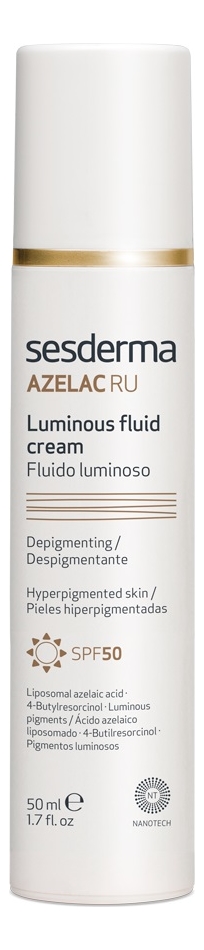 От производителя:Эмульсия для сияния кожи Azelac Ru Fluido Luminoso SPF50 от Sesderma ― это средство для интенсивного ухода за тусклой и пигментированной кожей. Комфортная текстура концентрата впитывается без липкой пленки. В его состав включены азелаиновая кислота, факторы роста, липосомы и 4-бутилрезорцинол. Такой микс снижает синтез меланина, мягко отшелушивает, увлажняет, подтягивает и разглаживает эпидермис. Продукт обогащен сияющими частичками для придания мгновенного ухоженного вида лицу. Курсовое применение этой сыворотки снижает выраженность присутствующих и предотвращает появление новых пигментных пятен, а также восстанавливает защитные функции и здоровый вид эпидермиса.Способ применения:Применяйте сыворотку ежедневно, нанося ее на очищенную и сухую кожу лица.Состав:Эмульсия для сияния кожи лица Sesderma Azelac Ru Fluido Luminoso SPF50 содержит: липосомированная азелаиновая кислота, 4-бутилрезорцинол, растительные факторы роста, липосомы, сияющие частички.