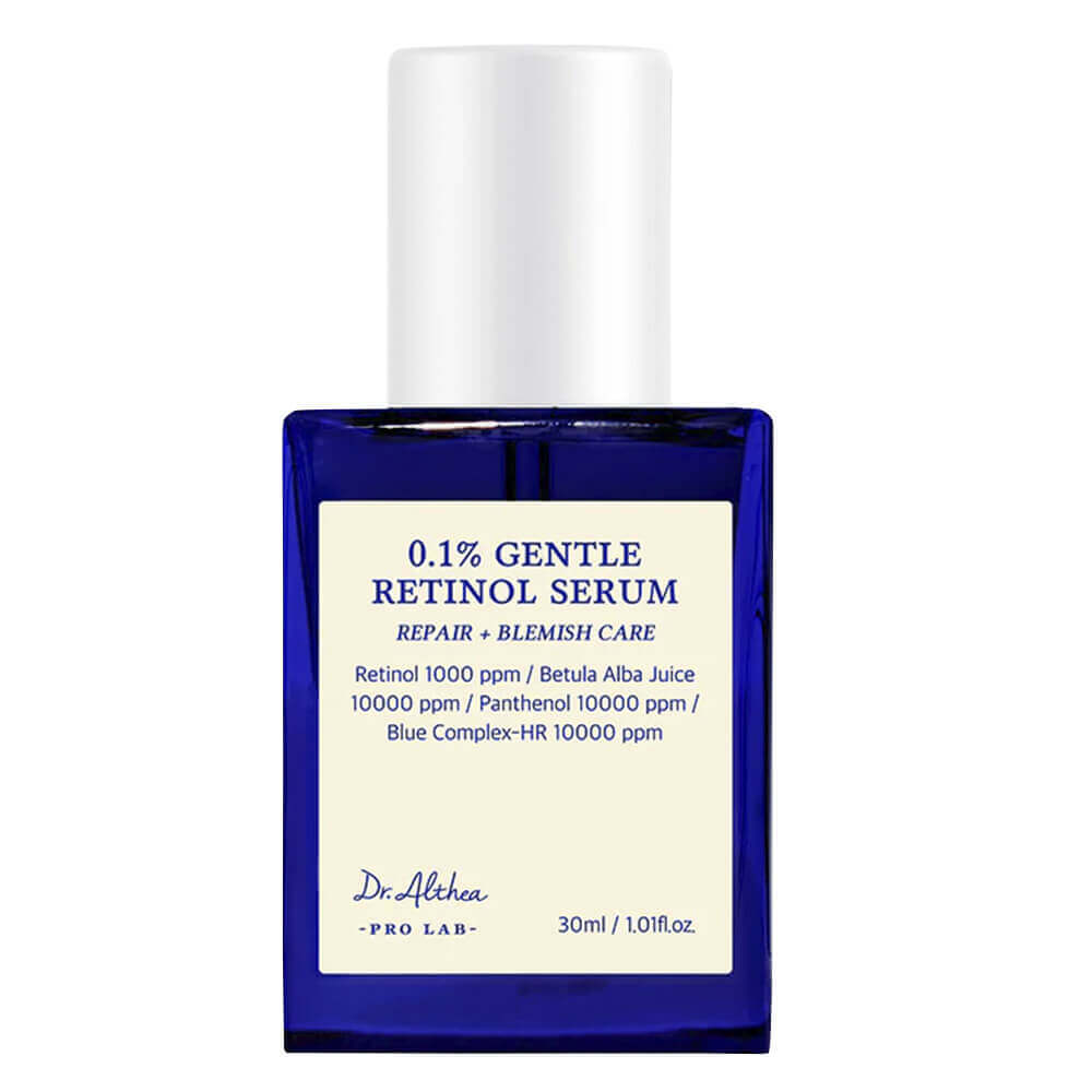 Деликатная сыворотка с 0,1% ретинола Dr. Althea Gentle Retinol Serum запускает процесс обновления клеток, за счёт чего улучшает состояние кожи: выравнивает текстуру, сужает поры, предотвращает воспаление, повышает эластичность и упругость. Устраняет тусклый тон, уменьшает выраженность морщин. Подходит для тех, кто только начинает знакомство в ретиноидами. Содержит ретинол и бакучиол, а также пантенол, берёзовый сок, масло сои и растительный комплекс Blue Complex-HR.