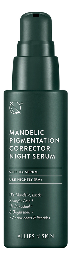 Состав:Обновляющая ночная сыворотка для лица с миндальной кислотой Mandelic Pigmentation Corrector Night Serum от Allies of Skin содержит Aqua (Water), Mandelic Acid (L), Glycerin, Butylene Glycol, Polysorbate 20, Niacinamide, Lactic Acid (L), Rosa Canina (Rose Hip) Fruit Oil (Organic), Calophyllum Inophyllum Seed Oil, Superoxide Dismutase, Bakuchiol, Salicylic Acid, Tocopheryl Acetate (D-alpha), Camellia Sinensis (White Tea) Leaf Extract, Panthenol (D), Sodium Hyaluronate, Hyaluronic Acid, Resveratrol Dimethyl Ether, Rumex Occidentalis Extract, Ascophyllum Nodosum Extract, Nonapeptide-1, Palmitoyl Tripeptide-5, Acetyl Tetrapeptide-40, Diethylhexyl Syringylidenemalonate, Dextran, Xanthan Gum, Sclerotium Gum, Ascorbic Acid, Tocopherol, Caprylic/ Capric Triglyceride, Ethylhexylglycerin, Sodium Gluconate, Caprylyl Glycol, Sodium Hydroxide, O-cymen-5-OL, Phenoxyethanol.