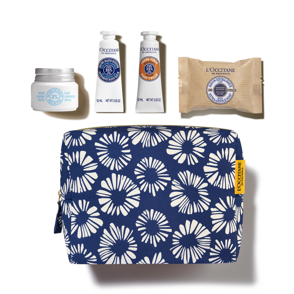 Состав: <br>Легкий крем-комфорт для лица Карите 8 мл<br>Питательный бальзам для рук Карите 10 мл<br>Крем для ног 10 мл<br>Мыло туалетное твердое "экстра-мягкое" 25 г<br>Косметичка <br>
