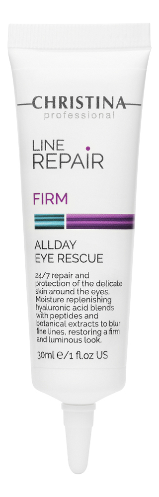 От производителя:Укрепляющий крем Line Repair Firm Allday Eye Rescue создан специалистами CHRISTINA для заботы о нежной коже вокруг глаз. Средство с консистенцией тающего флюида изготовлено на основе гиалуроновой кислоты, незаменимых витаминов, запатентованных комплексом Eye beautifier и Soothing plant blend.Эти компоненты наделяют крем успокаивающими, увлажняющими, защитными качествами, они стимулируют обменные процессы в тканях и их кровоснабжение, подталкивают замедляющуюся с возрастом выработку коллагена и эластина. Регулярный уход повышает способность кожи сопротивляться внешним опасностям, включая ультрафиолет и слияние свободных радикалов. Крем делает кожу более эластичной, плотной и упругой, восстанавливает тонус и ровный сияющий тон.Способ применения:Нанесите небольшое количество средства на кожу вокруг глаз. Легкими массирующими и похлопывающими движениями внедрите до полного впитывания. Использовать во время вечернего ухода. Состав:Укрепляющий крем для кожи вокруг глаз Line Repair Firm Allday Eye Rescue от CHRISTINA содержит Deionized water (Aqua), Dimethicone, Phenoxyethanol, Caprylyl Glycol, 1,2-Hexanediol, BHT, Butylene Glycol, Cetearyl Ethylhexanoate, Ethylhexylglycerin, Glycerin, Glycine Soja (Soybean) Protein, Helianthus Annuus (Sunflower) Seed Oil, Hydrogenated Castor Oil, Hydrogenated Polyisobutene, Hydrolyzed Rice Bran Protein, Lecithin, Magnesium Sulfate, Magnolia Biondii Bud/Flower Extract, Melissa Officinalis Leaf Extract, Microcrystalline Wax, Panthenol, Polyglyceryl-3 Diisostearate, Potassium Sorbate, Retinyl Palmitate, Sodium Benzoate, Sodium Dextran Sulfate, Sodium hyaluronate, Superoxide Dismutase, Tocopheryl Acetate.