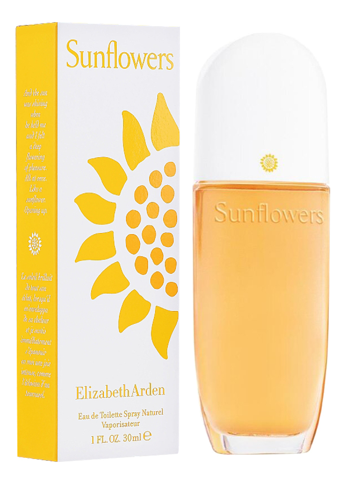 Elizabeth Arden Sunflowers («Элизабет Арден. Подсолнухи») – красочный, цветущий аромат с нотами фруктов, созданный в 1993 году, он по сей день пользуется заслуженной любовью и популярностью среди представительниц прекрасного пола. Этот аромат станет незаменимым аксессуаром на пляже или на отдыхе. Также как парфюм Green Tea, он очень легок и воздушен, поэтому подойдет женщинам любого возраста. Парфюм Elizabeth Arden Sunflowers обладает классическим характером, но при этом сладок и красочен. Он превосходно освежает и заряжает оптимизмом, поднимает настроение и мир кажется полным солнечного света и праздника. Вдохните его и почувствуйте, словно перенеслись на бескрайнее поле, полное солнечных, веселых, позитивных подсолнухов!Парфюмерная композиция аромата состоит из нот цветов апельсина, красного дерева, лимона, мандарина, розы, цикламена, жасмина, кедра и янтаря.