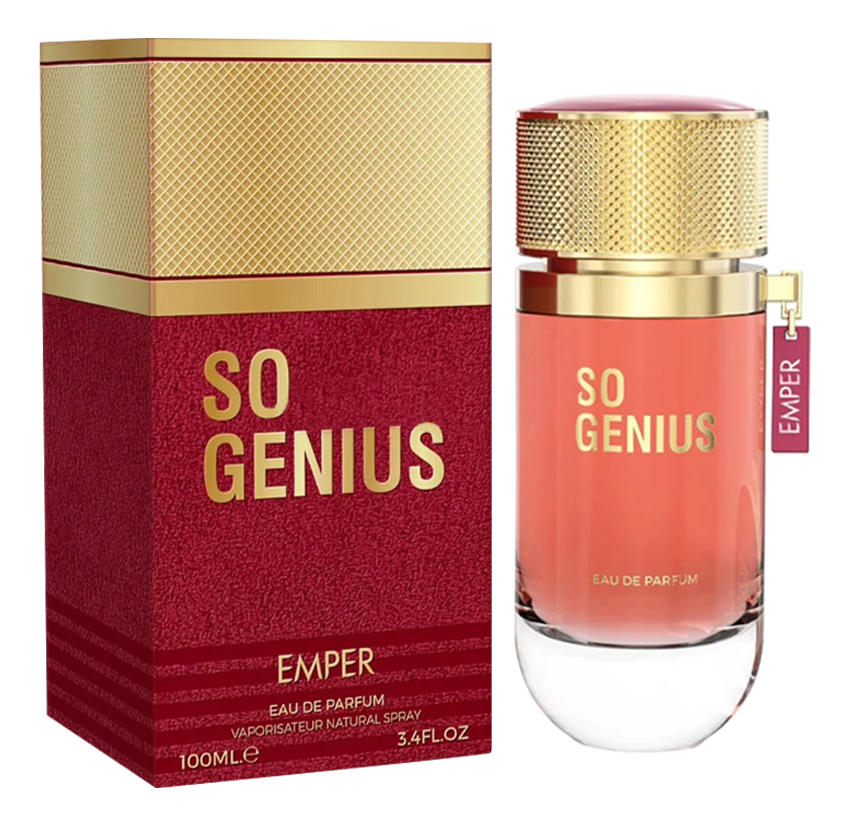 Emper So Genius — красивый и дерзкий цветочно-фруктовый унисекс-аромат с легкими гурманскими полутонами, выпущенный в 2023 году арабским парфюмерным брендом Emper в рамках коллекции Genius. Похожий на капсулу флакон персикового цвета отражает особый стиль, роскошь и современность заключенной в нем ароматической композиции. Это аромат, который носят успешные люди, ценящие красоту жизни. Восхитительная жизнь, полная нескончаемого счастья и блаженства.Вначале парфюма звучит тонкий сладкий запах спелых ягод малины. В сердечном аккорде душистый апельсиновый цвет сочетается с пряной туберозой. Им на смену в базе композиции Emper So Genius приходит опьяняющий аромат жасмина самбака, который получает совершенно неожиданные аспекты звучания в соседстве со сливочными оттенками молока.