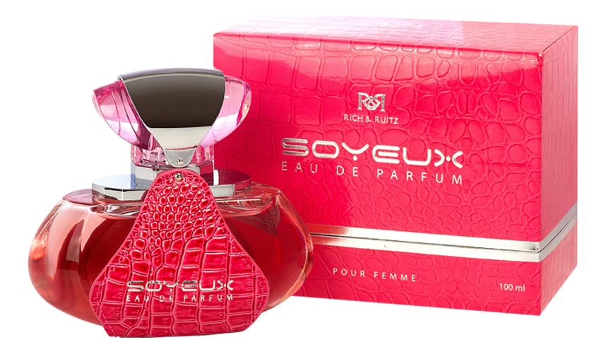 Rich & Ruitz Soyeux — красивый и нежный цветочно-фруктовый женский парфюм от арабского парфюмерного бренда Rich & Ruitz, выпущенный в 2012 году. Очаровательный аромат впишется в любой женский образ, а красивый в форме кристалла розовый флакон станет украшением туалетного столика. Ароматическая композиция начинается с фейерверка цитрусовой свежести мандарина, сладости черной смородины и сладковато-дымных оттенков сухофруктов, в обрамлении пряно-перечных нот герани. Фруктовый букет постепенно сменяется легким и изящным цветочным аккордом, состоящим из изысканной белой лилии, нежного, трогательного апельсинового цвета и ароматного жасмина. Вместе они составляют красивое цветочное сердце композиции Rich & Ruitz Soyeux, которая завершается ярким, теплым шлейфом из смолистого янтаря и изысканного, почти невесомого белого мускуса.