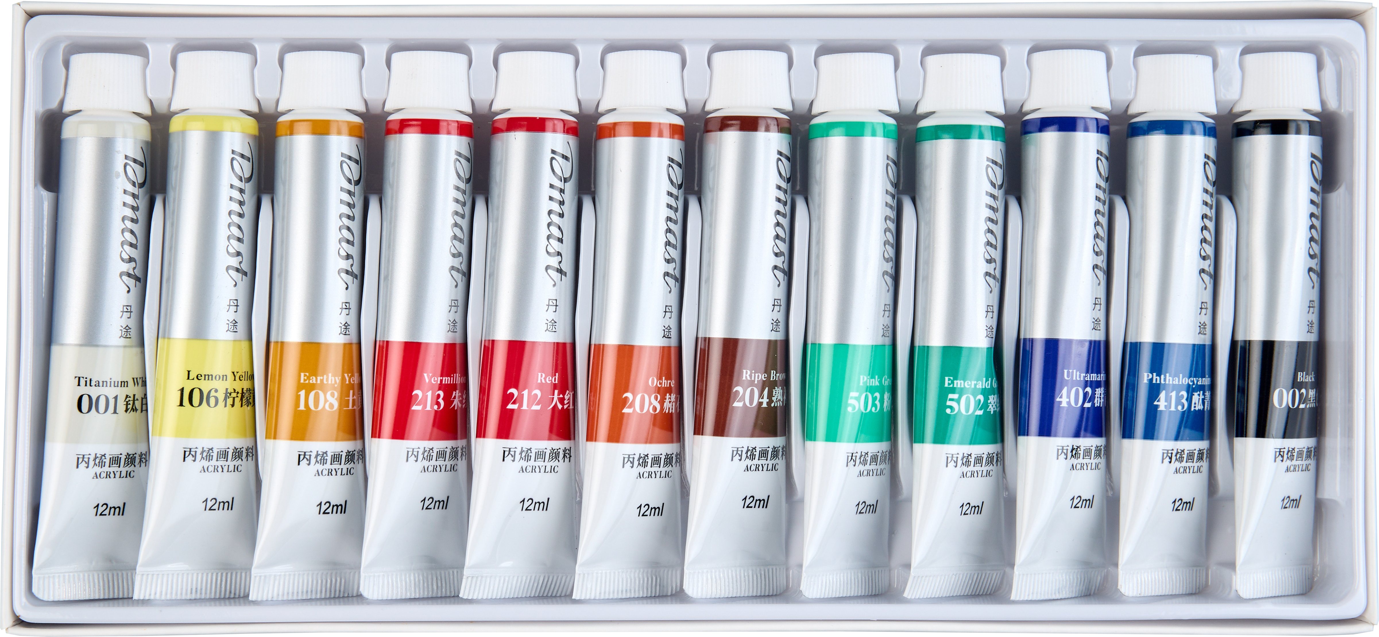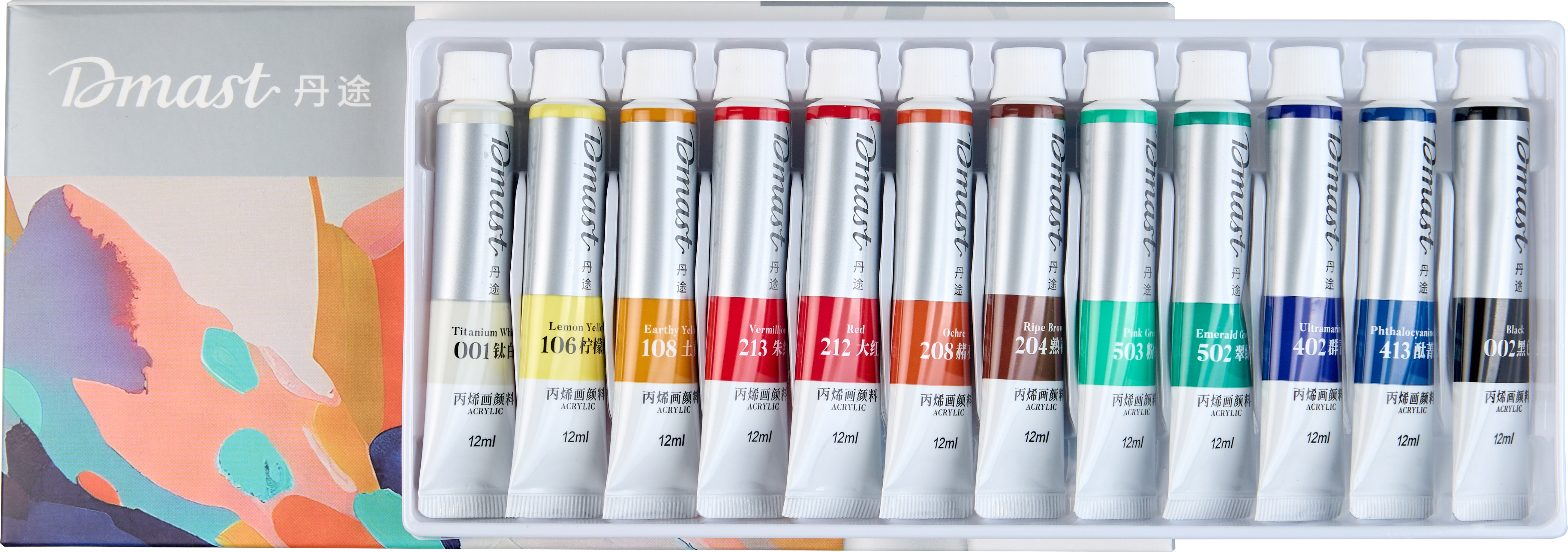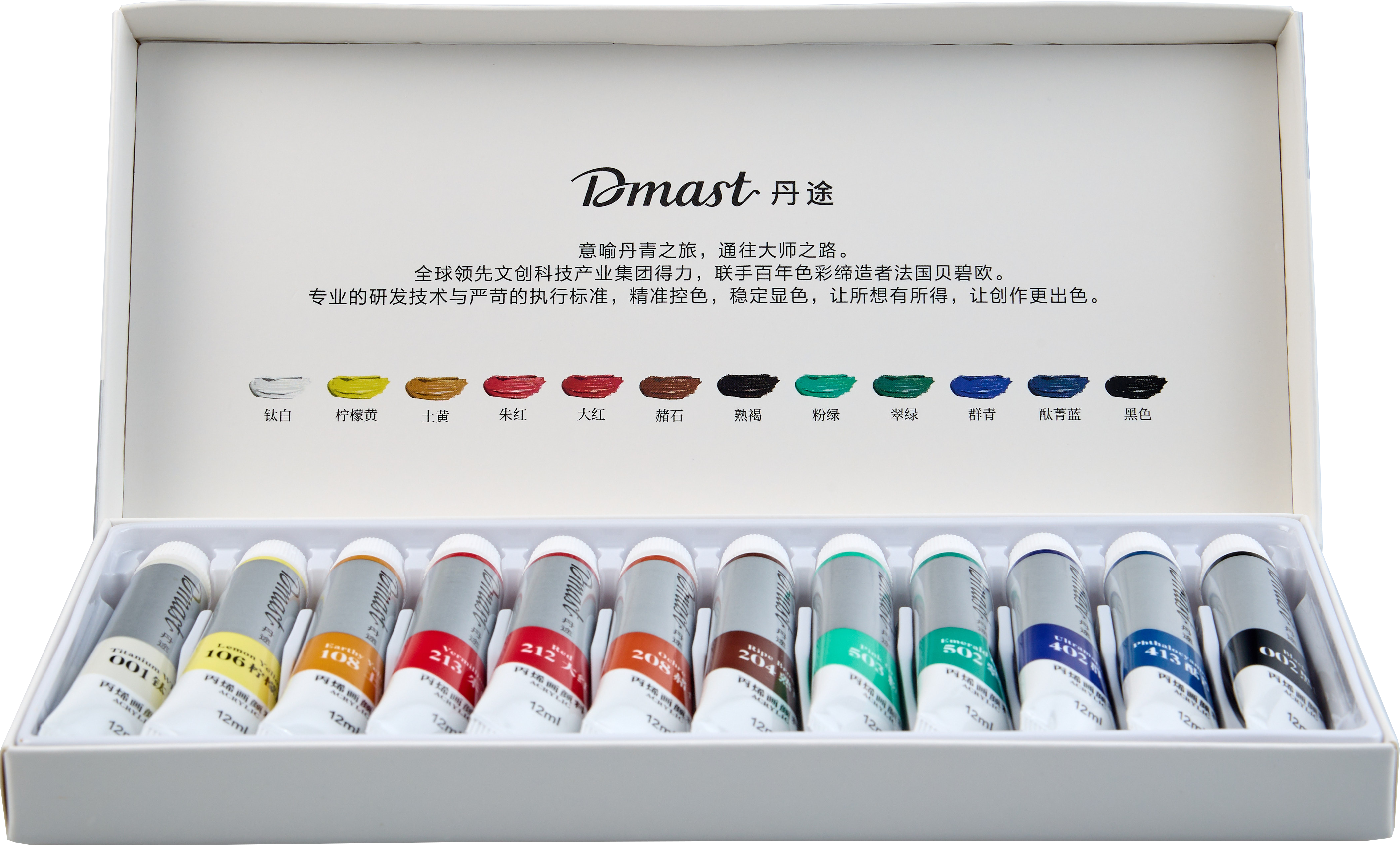 Художественные акриловые краски Dmast изготовлены из пигментов мелкого равномерного помола и акриловых смол. Высокая концентрация пигментов обеспечивает отличную цветопередачу и высокую светостойкость. Краски Dmast имеют чистые насыщенные цвета и глянцевый финиш, степень блеска 70 G. Краски обладают высокой адгезией, удерживают объём и подходят для пастозных техник. После высыхания красочный слой устойчив к воде и внешним воздействиям, благодаря чему акриловые краски Dmast имеют широкий спектр применения: они подходят для живописи, декора обуви, одежды и мебели, раскрашивания моделей, внутренних и наружных работ по росписи. Цвета в наборе: Белила титановые, Желтый лимонный, Желтый земельный, Вермиллион, Красный, Охра, Коричневый насыщенный, Зеленый розоватый, Зеленый изумрудный, Ультрамарин, Синий фталоцианин, Черный. Продукция бренда Dmast создана благодаря сочетанию высокого качества выверенных технологий бренда Pebeо и инновационным производственным процессам компании Deli — крупнейшего производителя канцелярских товаров в Азии.