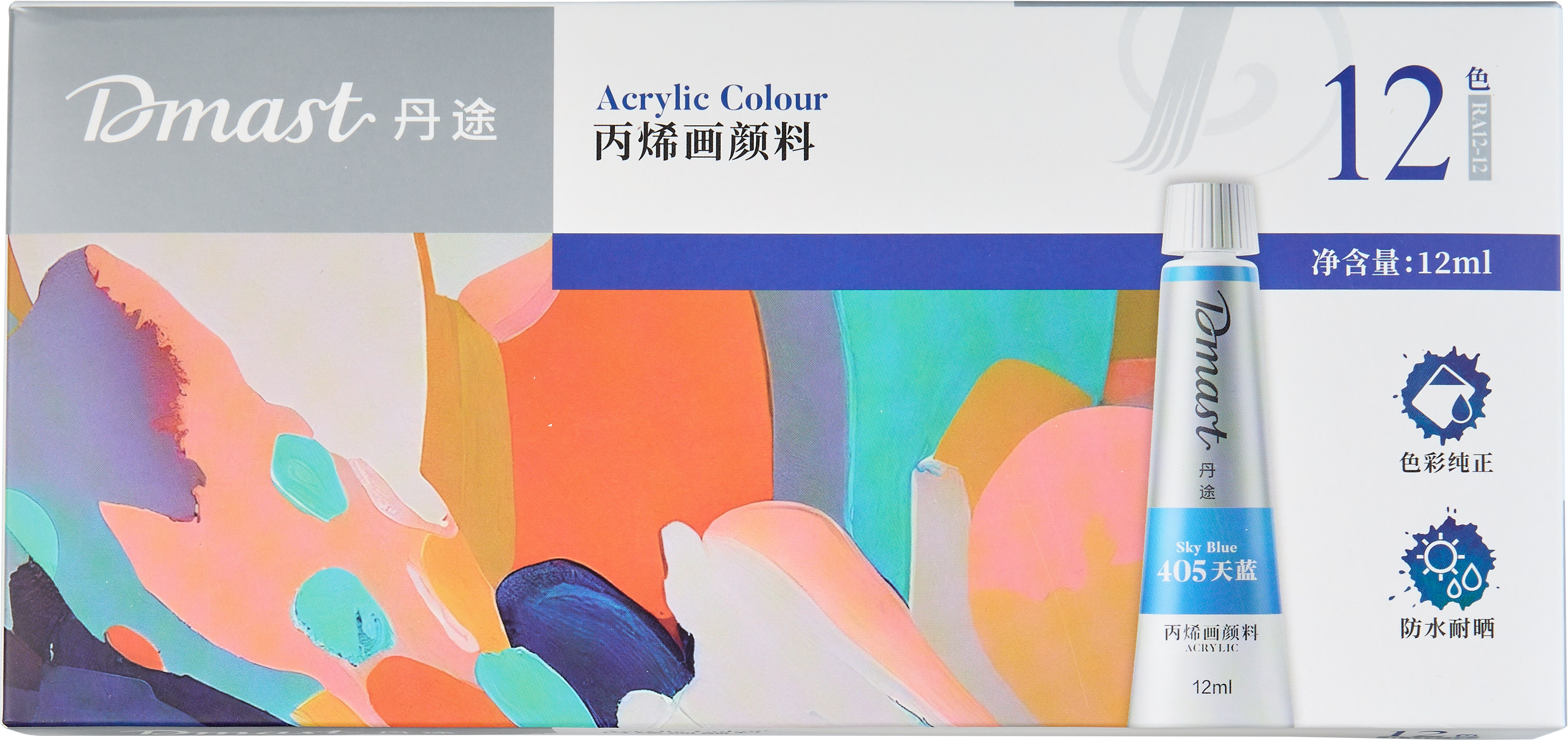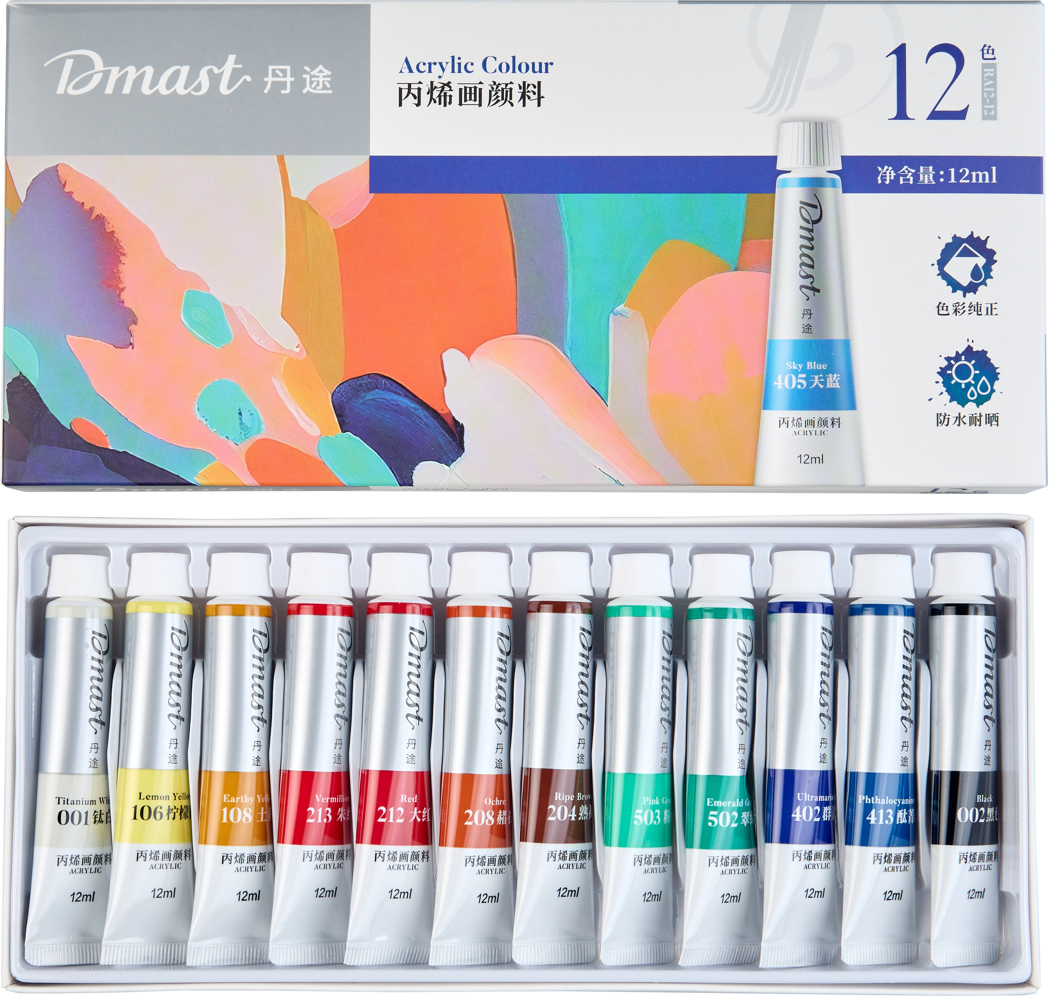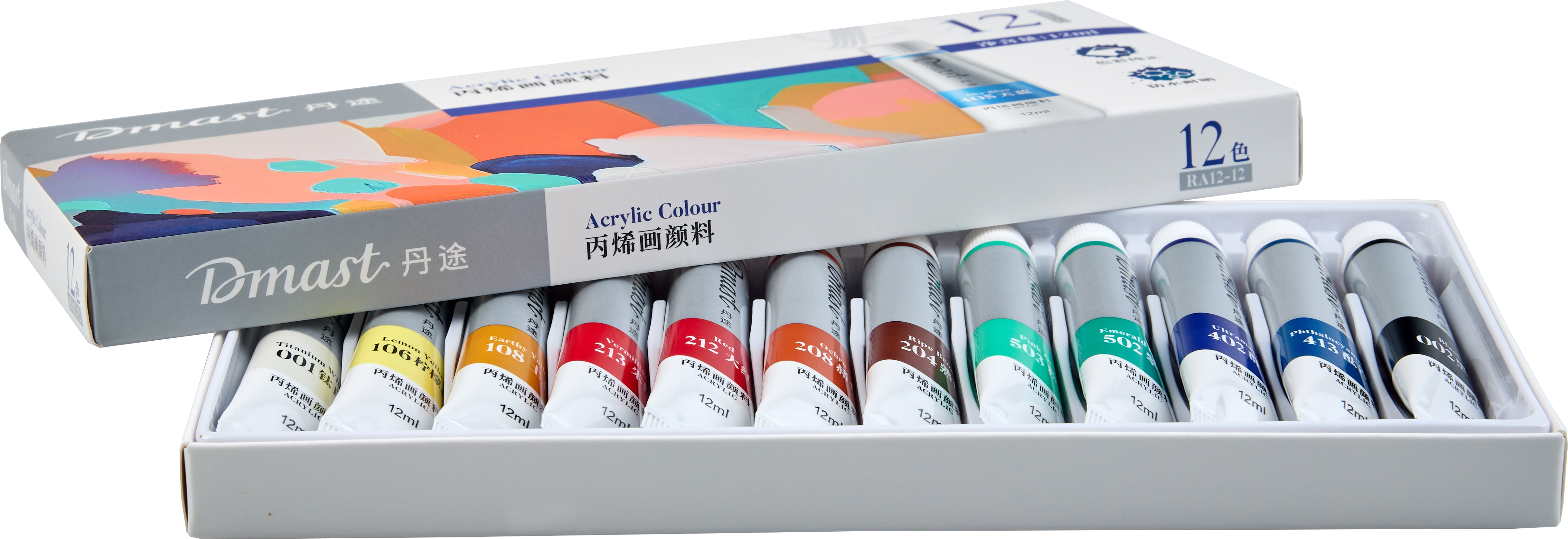 Художественные акриловые краски Dmast изготовлены из пигментов мелкого равномерного помола и акриловых смол. Высокая концентрация пигментов обеспечивает отличную цветопередачу и высокую светостойкость. Краски Dmast имеют чистые насыщенные цвета и глянцевый финиш, степень блеска 70 G. Краски обладают высокой адгезией, удерживают объём и подходят для пастозных техник. После высыхания красочный слой устойчив к воде и внешним воздействиям, благодаря чему акриловые краски Dmast имеют широкий спектр применения: они подходят для живописи, декора обуви, одежды и мебели, раскрашивания моделей, внутренних и наружных работ по росписи. Цвета в наборе: Белила титановые, Желтый лимонный, Желтый земельный, Вермиллион, Красный, Охра, Коричневый насыщенный, Зеленый розоватый, Зеленый изумрудный, Ультрамарин, Синий фталоцианин, Черный. Продукция бренда Dmast создана благодаря сочетанию высокого качества выверенных технологий бренда Pebeо и инновационным производственным процессам компании Deli — крупнейшего производителя канцелярских товаров в Азии.