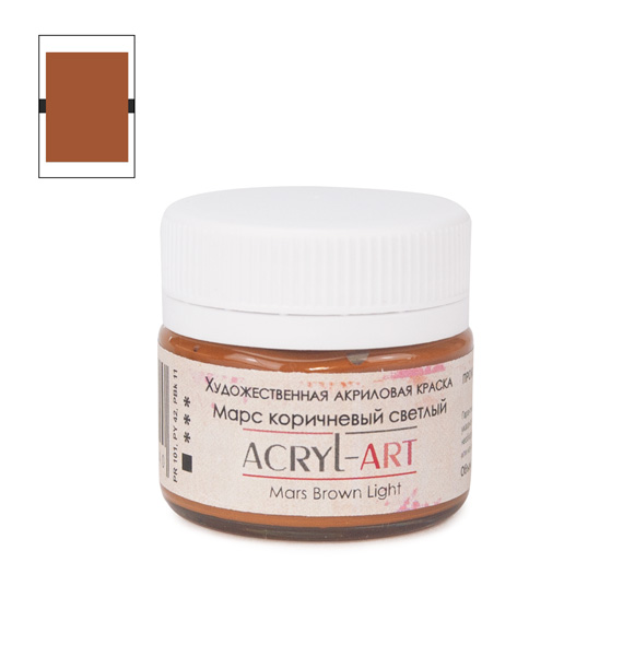 Краски «Акрил-Арт» — это профессиональные полуглянцевые акриловые краски, созданные специально для живописи. Густая консистенция красок Акрил-Арт позволяет создавать объёмную живопись, без применения дополнительных материалов. Для получения новых оттенков и варьирования насыщенности, можно смешивать краски между собой, разбавляя краски до нужной консистенции водой или акриловым лаком. Краски используются для живописи, декоративно-прикладного искусства и окрашивания любых поверхностей. После высыхания слой краски становится водостойким, с хорошей сопротивляемостью к механическим воздействиям. Консистенция: плотная, густая. Укрывистость: в зависимости от пигмента. Состав: акриловая дисперсия, тонкодисперсные пигменты, наполнитель, консерванты, загуститель, вода. Свойства: • После высыхания приобретает водостойкость; • Эластичный и механически прочный красочный слой; • Высокий уровень светостойкости (в зависимости от пигмента); • Хорошая сцепляемость с поверхностью; • Разбавляется водой, акриловым лаком, разбавителем акриловых красок и т.п.; • Время высыхания от одного часа до суток в зависимости от толщины слоя. • Устойчив к атмосферным воздействиям.