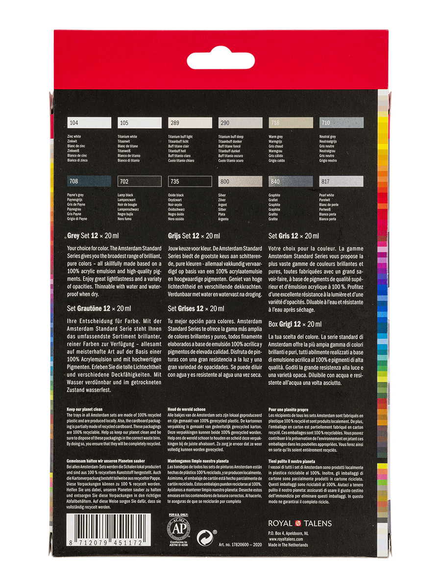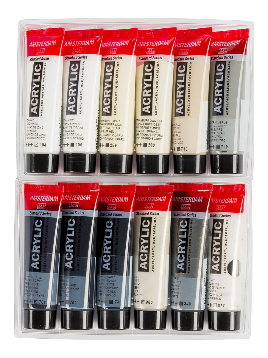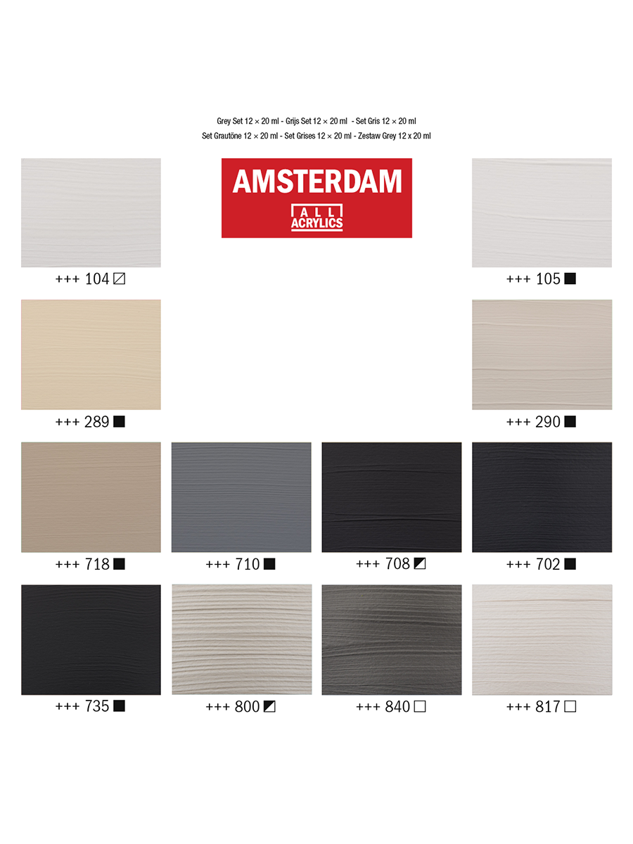 Акриловые краски серии AMSTERDAM от голландского производителя Royal Talens насчитывают в своей палитре 70 различных цветов и оттенков, способных удовлетворить потребности даже самого взыскательного художника. Все краски данной линейки на 100% состоят из акриловых смол, что обеспечивает им короткое время высыхания, а так же способствует появлению водонепроницаемой пленки на поверхности рисунка. Краски практически не обладают запахом, благодаря чему удобны в использовании как внутри помещения, так и на выставках, а так же отлично подходят для детского творчества. Яркость и насыщенность оттенков не теряется с годами, краски отличаются отличной светоустойчивостью, что обеспечивает длительный срок жизни картин в своём первозданном виде. Помимо высококачественных пигментов и смол, краски наделены особым связующим, что позволяет работать ими на любых поверхностях, не ограничивая тем самым личные предпочтения и творческий полет художника. Все краски отлично смешиваются между собой, что позволяет без труда добиться нужной консистенции и различных оттенков в процессе работы.