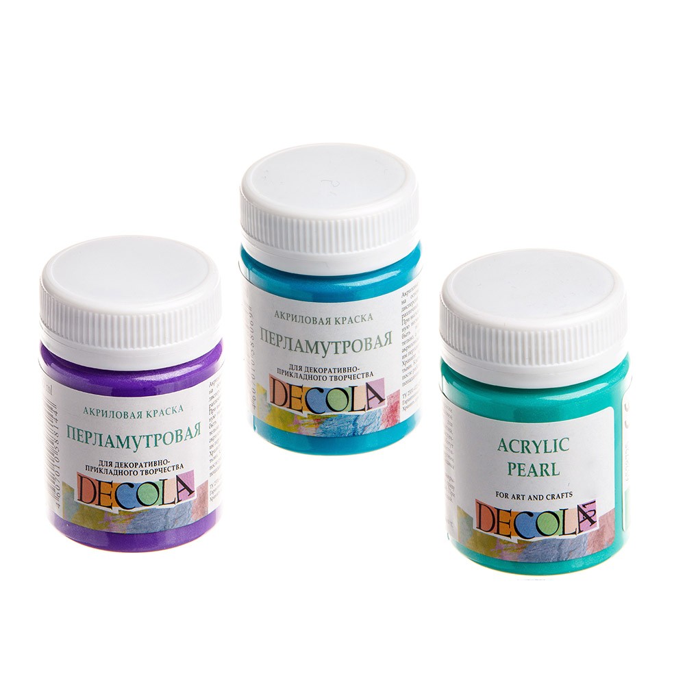 Акрил перламутровый «Decola» производится заводом художественных красок Невская палитра, расположенным в городе Санкт-Петербурге. Завод уже более 80 лет выпускает продукцию для профессиональных художников и любителей творчества. Перламутровая акриловая краска «Decola» изготовлена на основе водной акриловой дисперсии с добавлением большого количества пигментов. Краска универсальна, она широко используется в художественных работах для придания различных эффектов, так же применяется в дизайнерских и декоративно-прикладных работах. Краски «Decola» хорошо ложатся на бумагу, картон, грунтованный холст, кожу и другие поверхности. Обладают хорошей укрывистостью. В серии перламутрового акрила «Decola» представлено 10 цветов, которые выпускаются в баночках по 50 миллилитров.