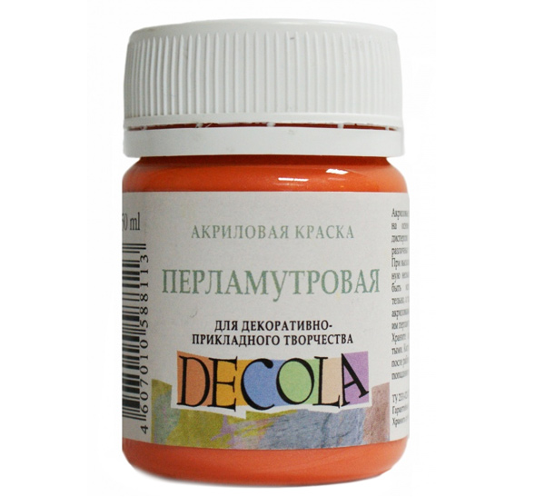 Акрил перламутровый «Decola» производится заводом художественных красок Невская палитра, расположенным в городе Санкт-Петербурге. Завод уже более 80 лет выпускает продукцию для профессиональных художников и любителей творчества. Перламутровая акриловая краска «Decola» изготовлена на основе водной акриловой дисперсии с добавлением большого количества пигментов. Краска универсальна, она широко используется в художественных работах для придания различных эффектов, так же применяется в дизайнерских и декоративно-прикладных работах. Краски «Decola» хорошо ложатся на бумагу, картон, грунтованный холст, кожу и другие поверхности. Обладают хорошей укрывистостью. В серии перламутрового акрила «Decola» представлено 10 цветов, которые выпускаются в баночках по 50 миллилитров.