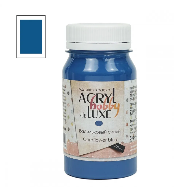 Акрил Hobby DeLuxe – краска на акриловой основе. Эта серия отличается от других большим количеством мягких пастельных оттенков и хорошей укрывистостью. Краска обладает слабовыраженным запахом, который исчезает при высыхании. Акрил Hobby DeLuxe хорошо подходит для декоративно-прикладных работ. Разбавляется водой или разбавителем акриловых красок. Красочный слой после высыхания становится водостойким и устойчивым к выцветанию. Hobby DeLuxe можно сочетать с другими акриловыми красками и акриловыми материалами (пасты, гели, различные добавки), что значительно расширяет художественные возможности. Акрил Hobby DeLuxe представлен палитрой из разнообразных пастельных оттенков. Все цвета выполнены с использованием 4-5 пигментов. Палитра цветов постоянно расширяется, и выпускаются новые оттенки. Акрил предлагается поштучно в баночках по 100 миллилитров. Акрил Hobby DeLuxe («Хобби Де Люкс») выпускается компанией «Таир», которая была основана в 1997 году в Санкт-Петербурге. Компания постоянно развивается и уже более 15 лет успешно работает на рынке художественных материалов.