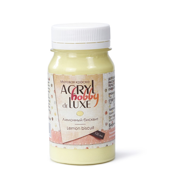 Акрил Hobby DeLuxe – краска на акриловой основе. Эта серия отличается от других большим количеством мягких пастельных оттенков и хорошей укрывистостью. Краска обладает слабовыраженным запахом, который исчезает при высыхании. Акрил Hobby DeLuxe хорошо подходит для декоративно-прикладных работ. Разбавляется водой или разбавителем акриловых красок. Красочный слой после высыхания становится водостойким и устойчивым к выцветанию. Hobby DeLuxe можно сочетать с другими акриловыми красками и акриловыми материалами (пасты, гели, различные добавки), что значительно расширяет художественные возможности. Акрил Hobby DeLuxe представлен палитрой из разнообразных пастельных оттенков. Все цвета выполнены с использованием 4-5 пигментов. Палитра цветов постоянно расширяется, и выпускаются новые оттенки. Акрил предлагается поштучно в баночках по 100 миллилитров. Акрил Hobby DeLuxe («Хобби Де Люкс») выпускается компанией «Таир», которая была основана в 1997 году в Санкт-Петербурге. Компания постоянно развивается и уже более 15 лет успешно работает на рынке художественных материалов.