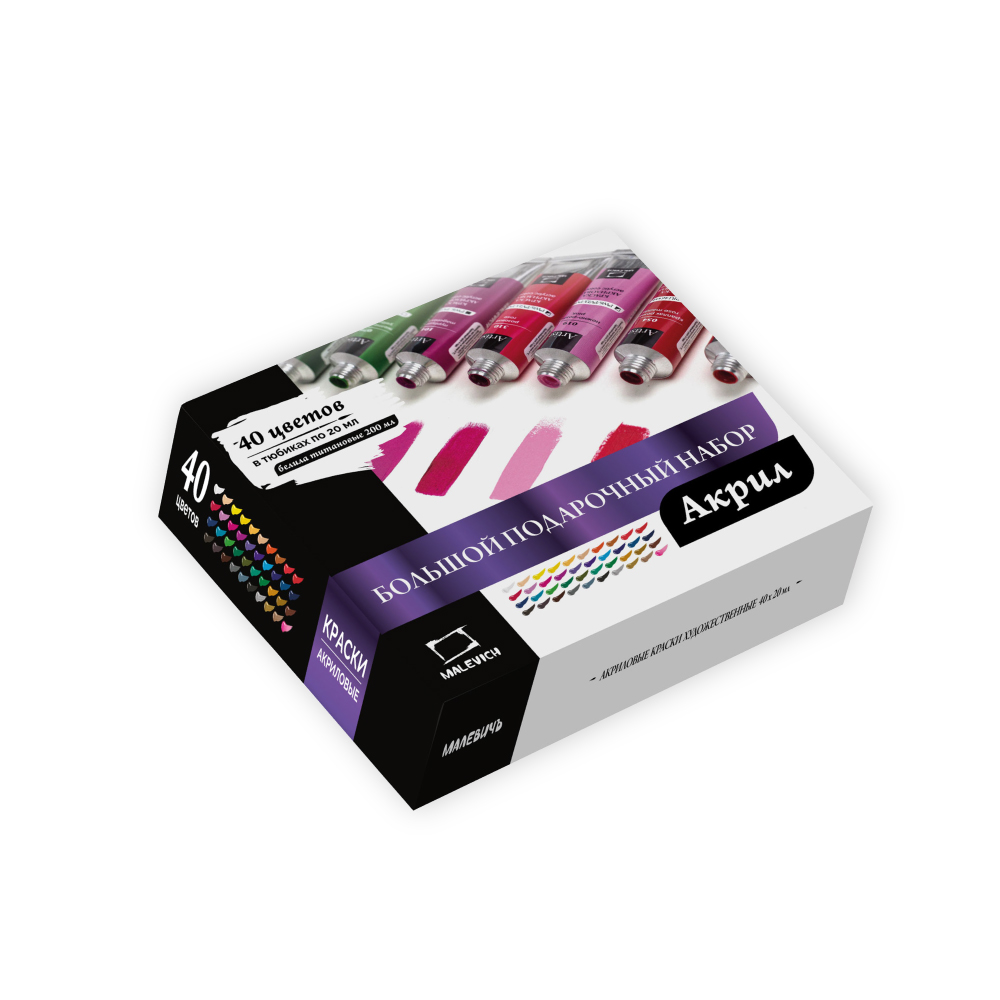 Акрил «Малевичъ» изготовлен из высококачественных натуральных пигментов с применением современных связующих веществ, благодаря чему он имеет яркие, насыщенные цвета имеют с высокой степенью светостойкости. Густая консистенция краски дает возможность художнику писать пастозно, выделять объем, что отвечает потребностям последних тенденций живописи. Акрил хорошо разбавляется водой и подходит для росписи по любой поверхности. Также можно использовать его в технике декупаж, росписи по ткани, дереву, металлу, камню или стеклу. При высыхании акрил образует водостойкую пленку, которая прочно закрепляется на поверхности. Акрил быстро сохнет, буквально через час работу можно покрывать лаком. В наборе 40 туб разных цветов по 20 мл и банка белил 200 мл.