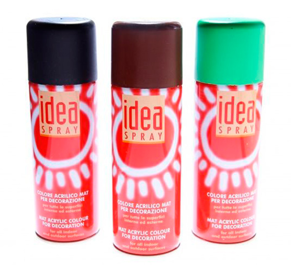 Акриловые краски IDEA в аэрозоли создаются на водной основе без применения растворителей. Краска IDEA удобна и универсальна в своем применении. Она хорошо ложится на различные типы поверхностей. Если поверхность пористая, рекомендуется нанести грунт. Серия красок IDEA в аэрозоли удобна при декорировании по трафаретам, ложится ровно и не оставляет следа от кисти. Краску можно использовать в закрытом помещении. Она быстро сохнет и не требует дополнительной отделки. Гамма красок IDEA представлена из 46-ти различных цветов в баллонах по 200 миллилитров. Присутствующие металлические, люминесцентные и фосфоресцирующие оттенки, расширяют творческий диапазон. Акриловые краски IDEA («Идея») в аэрозоли изготавливаются в Италии компанией Maimeri, одной из ведущих по производству художественных товаров. Компанию основал Джанни М?ймери, и она работает на художественном рынке с начала ХХ века.