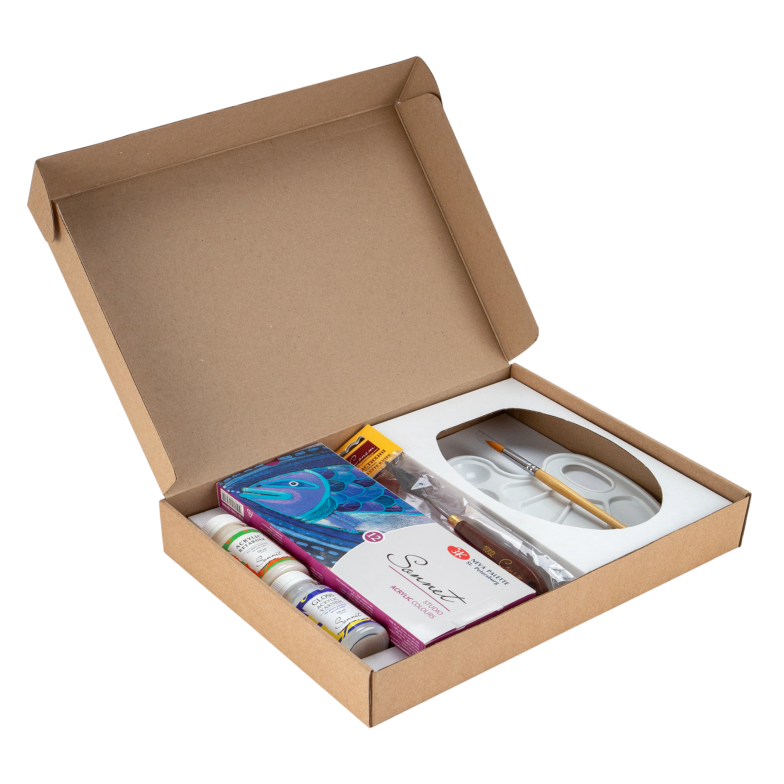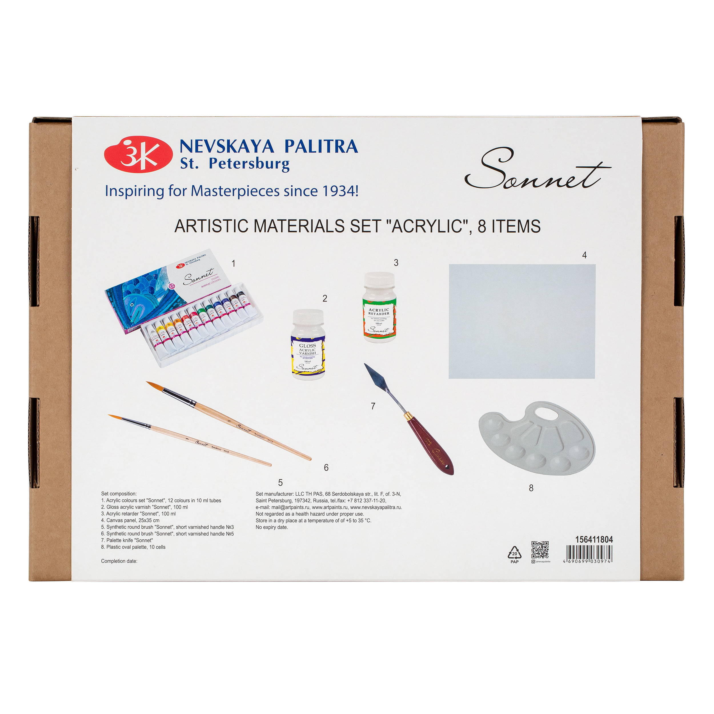 Набор художественных материалов Сонет "Акрил" отлично подойдет начинающим художникам и тем, кто хочет попробовать себя в живописной технике акрилом. В наборе есть всё самое необходимое для создания первых шедевров: Набор акриловых красок "Сонет" из 12 туб по 10 мл.; Лак акриловый глянцевый "Сонет" 100 мл.; Холст на картоне 25х35 см.; Кисть синтетика круглая на короткой ручке №3; Кисть синтетика круглая на короткой ручке №5; Мастихин "Сонет" Палитра пластиковая овальная, 10 ячеек. Цвета в наборе: Белила титановые, Лимонная, Желтая средняя, Охра светлая, Красная светлая или Красная темная, Карминовая, Зеленая светлая, Зеленая «ФЦ» или Зеленая темная, Синяя светлая или Голубая «ФЦ», Ультрамарин, Умбра жженая, Черная.
