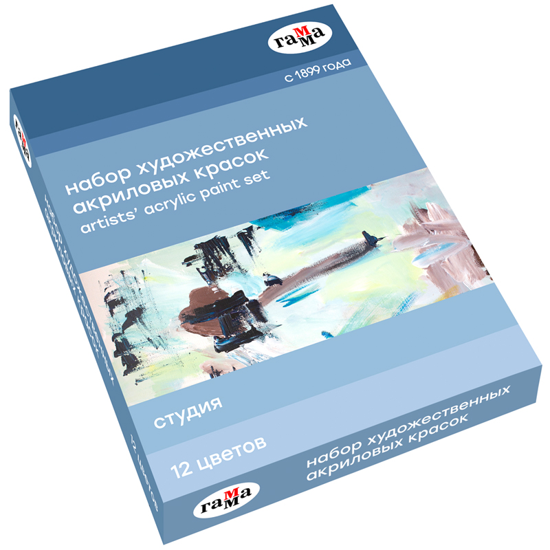 Набор новых акриловых красок серии «Студия» предназначен для художественно-живописных и декоративно-прикладных работ. Главные отличия: насыщенные цвета, высокая адгезия, прочность красочного слоя. После высыхания краски становятся глянцевыми, практически не темнеют, специальная добавка позволяет максимально раскрыть красоту цветов. Художественный акрил прекрасно разносится, подходит для бумаги, картона, грунтованного холста, дерева, стекла, кожи, ткани. Время высыхания: от 10 минут до 1 часа в зависимости от толщины слоя. В упаковке 12 цветов. Объём тубы — 9 мл.