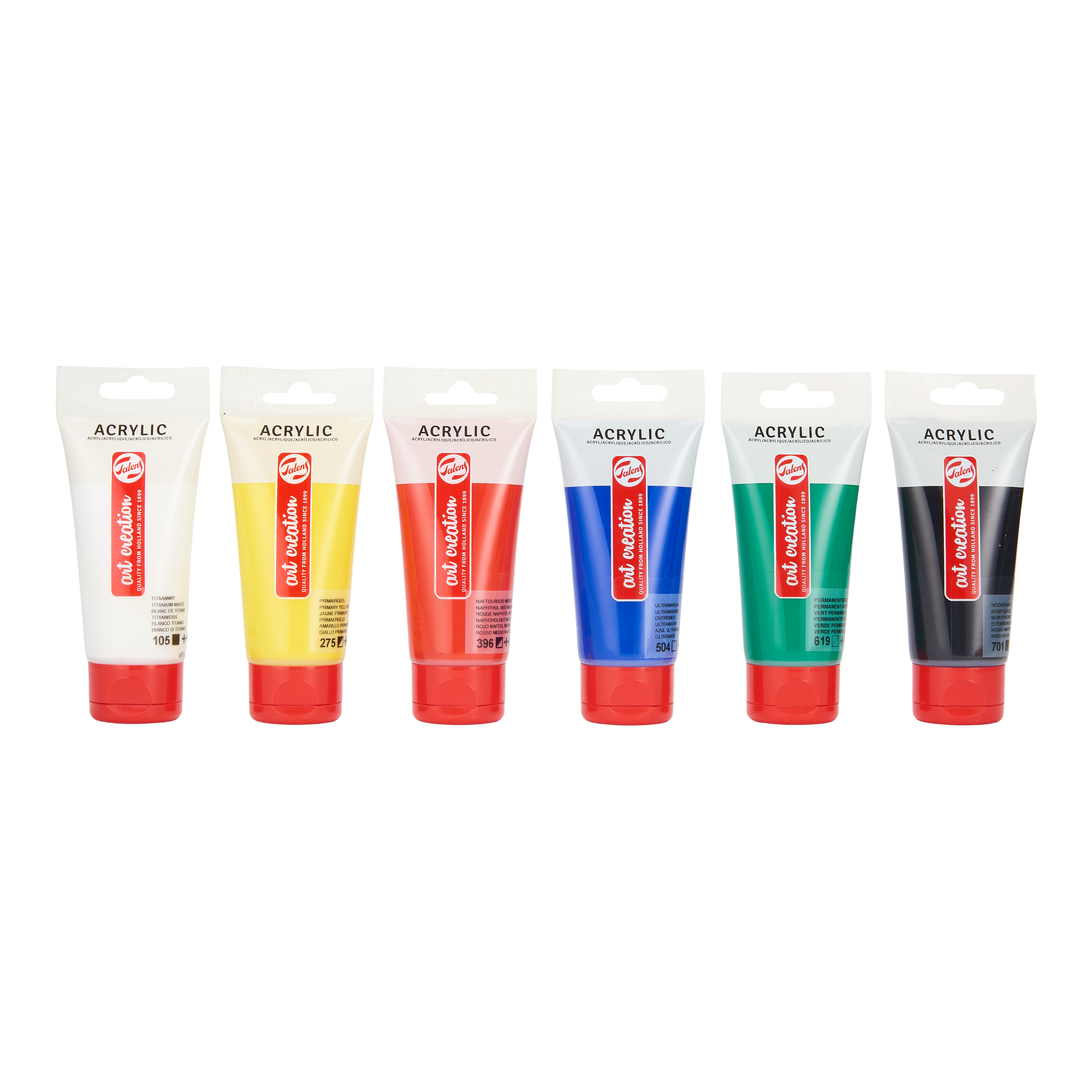 О серии: акриловые краски «Art Creation» - уникальные и современные краски, которые произведены из 100% акриловой смолы. Идеальны для начинающих художников. Серия красок представлена палитрой из 38 цветов. Представлены поштучно в тубах по 70 миллилитров, в банках по 750 миллилитров и в наборах различной комплектации. Производство: производится в городе Апелдорн голландской компанией «ROYAL TALENS», которую основал. Мартин Таленс (Marten Talens) в 1899 году. «ROYAL TALENS» производит все виды художественных красок и является одним из ведущих производителей в своей отрасли. Характеристика: краска имеет густую пастообразную структуру, при необходимости разводится водой. Быстросохнущая. После высыхания образует прочную несмываемую плёнку. Применение: краска предназначена для художественных, живописных и оформительских работ. Подходит для работы в пастозных техниках. Комплектация:в набор вошло 6 туб с краской по 75 миллилитров. Набор упакован в картонную коробку.
