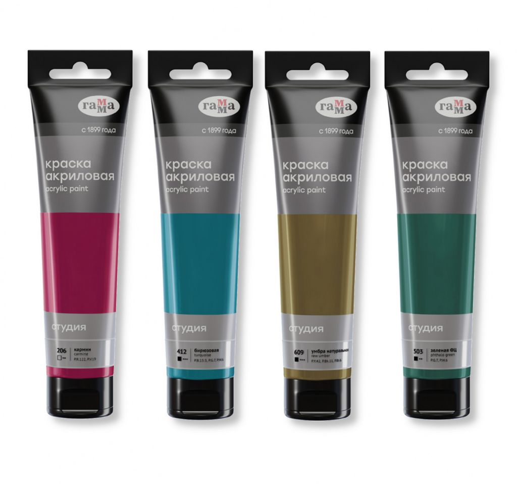Акриловые краски «Студия» предназначены для художественно-живописных и декоративно-прикладных работ. Их отличают насыщенные цвета, высокая адгезия, отличная прочность. После высыхания становятся глянцевыми, практически не темнеют, специальные добавки позволяют максимально раскрыть красоту цвета. Акриловые краски «Студия» обладают густой консистенций, высокой разносимостью, позволяя писать в различных техниках живописи. Время высыхания от 10 минут до 1 часа в зависимости от толщины слоя краски. Подходят для бумаги, картона, грунтованного холста, дерева, стекла, кожи, ткани. Прозрачный корпус тубы позволяет увидеть цвет краски, а удобная крышка флип-топ предотвращает высыхание краски в тубе.
