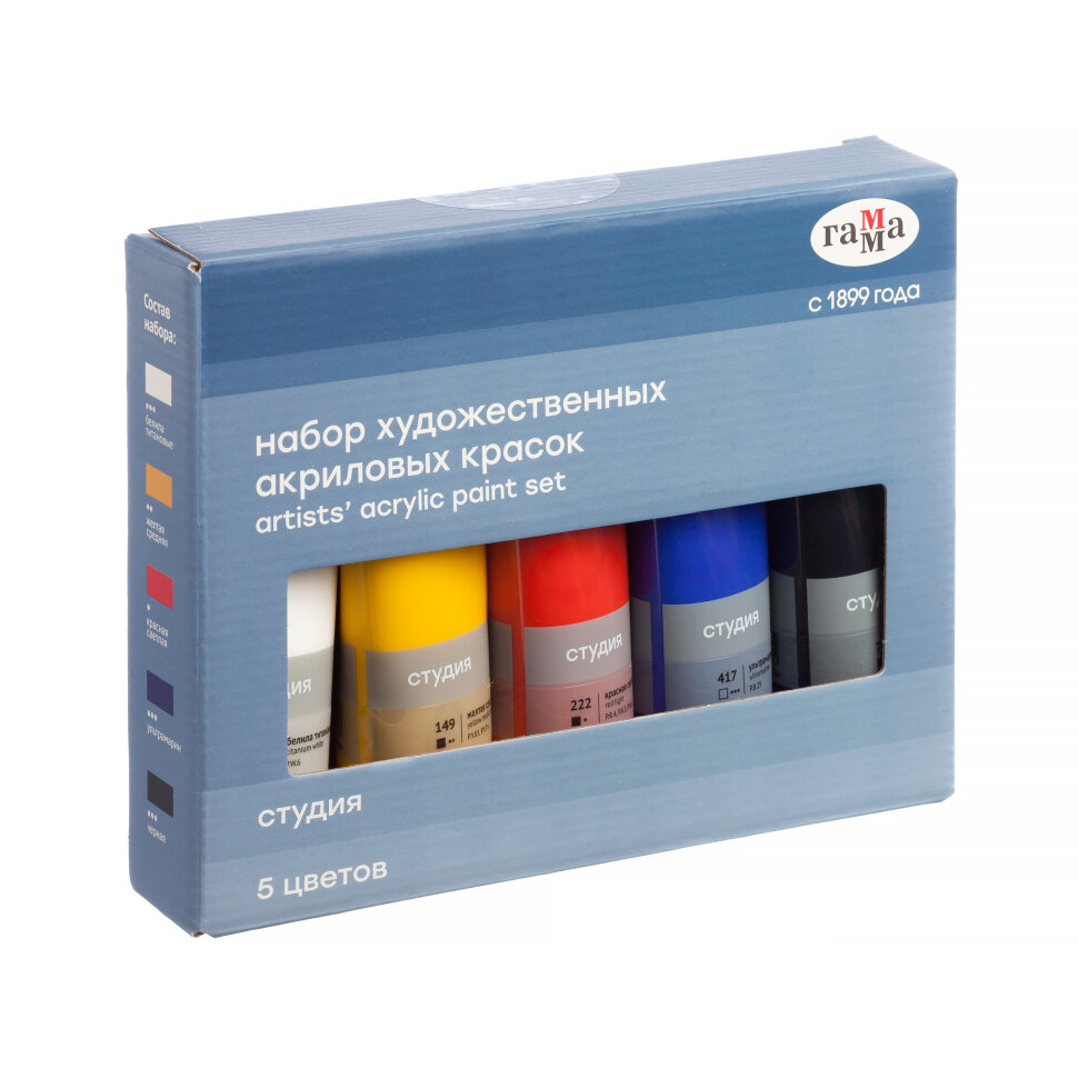 Наборы новых акриловых красок "Студия" предназначены для художественно-живописных и декоративно-прикладных работ. В наборах собраны основные цвета. Акриловые краски «Студия» отличают насыщенные цвета, высокая адгезия, отличная прочность. После высыхания становятся глянцевыми, практически не темнеют, специальные добавки позволяют максимально раскрыть красоту цвета. Краски обладают густой консистенцией, высокой разносимостью, позволяя писать в различных техниках живописи. Время высыхания от 10 минут до 1 часа в зависимости от толщины слоя краски. Подходят для бумаги, картона, грунтованного холста, дерева, стекла, кожи, ткани. Прозрачный корпус тубы позволяют увидеть цвет краски, а удобная крышка флип-топ предотвращает высыхание краски в тубе.