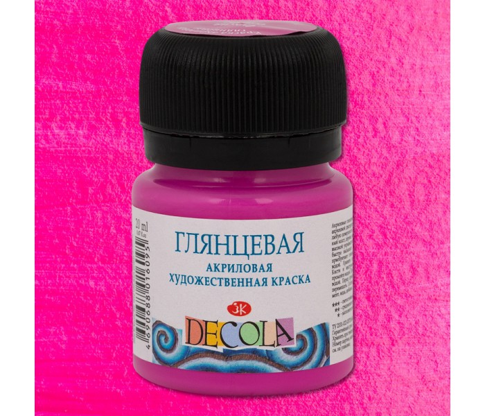 Акрил глянцевый «Decola» изготовлен на основе водной акриловой дисперсии. Для достижения художественных эффектов краски можно использовать в сочетании с медиумами и различными добавками. Краски «Decola» подходят для работы на таких поверхностях, как: бумага, холст, дерево, металл, стекло, кожа. Все цвета хорошо смешиваются между собой и при необходимости разбавляются водой. После высыхания краска становится водостойкой и приобретает глянцевый блеск. Палитра акрила глянцевого «Decola» постоянно расширяется, на сегодняшний день в ней представлено около 30 различных цветов, которые выпускаются поштучно в баночках по 20 и 50 миллилитров и в наборах различной комплектации. Акрил глянцевый «Decola» («Дек?ла») производится заводом художественных красок Невская палитра, расположенным в городе Санкт-Петербурге. Завод уже более 80 лет выпускает продукцию для профессиональных художников и любителей творчества.