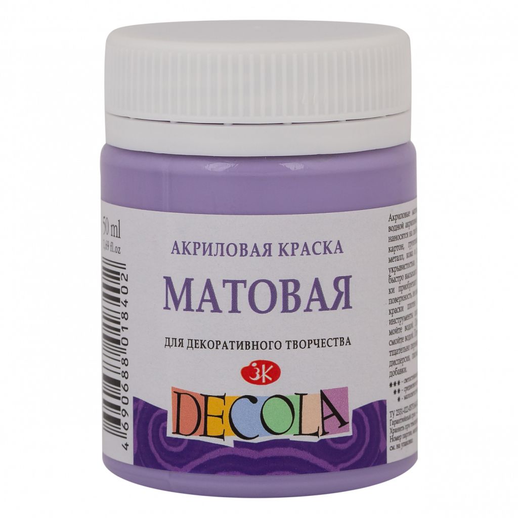 О серии: акрил «Decola» это современная акриловая краска для декоративного творчества. Палитра матового акрила «Decola» постоянно расширяется, на сегодняшний день в ней представлено около 30 различных цветов, которые выпускаются поштучно в баночках по 50 миллилитров и в наборах различной комплектации. Характеристика: акрил матовый «Decola» изготовлен на основе водной акриловой дисперсии. Для достижения художественных эффектов краски можно использовать в сочетании с медиумами и различными добавками. Все цвета хорошо смешиваются между собой и при необходимости разбавляются водой. После высыхания краска становится водостойкой и приобретает матовую поверхность. Применение: акриловые краски «Decola» подходят для работы на таких поверхностях, как бумага, холст, дерево, металл, стекло, кожа. Производство: глянцевый акрил «Decola» производится заводом художественных красок Невская палитра, расположенным в городе Санкт-Петербурге. Завод уже более 80 лет выпускает продукцию для профессиональных художников и любителей творчества.