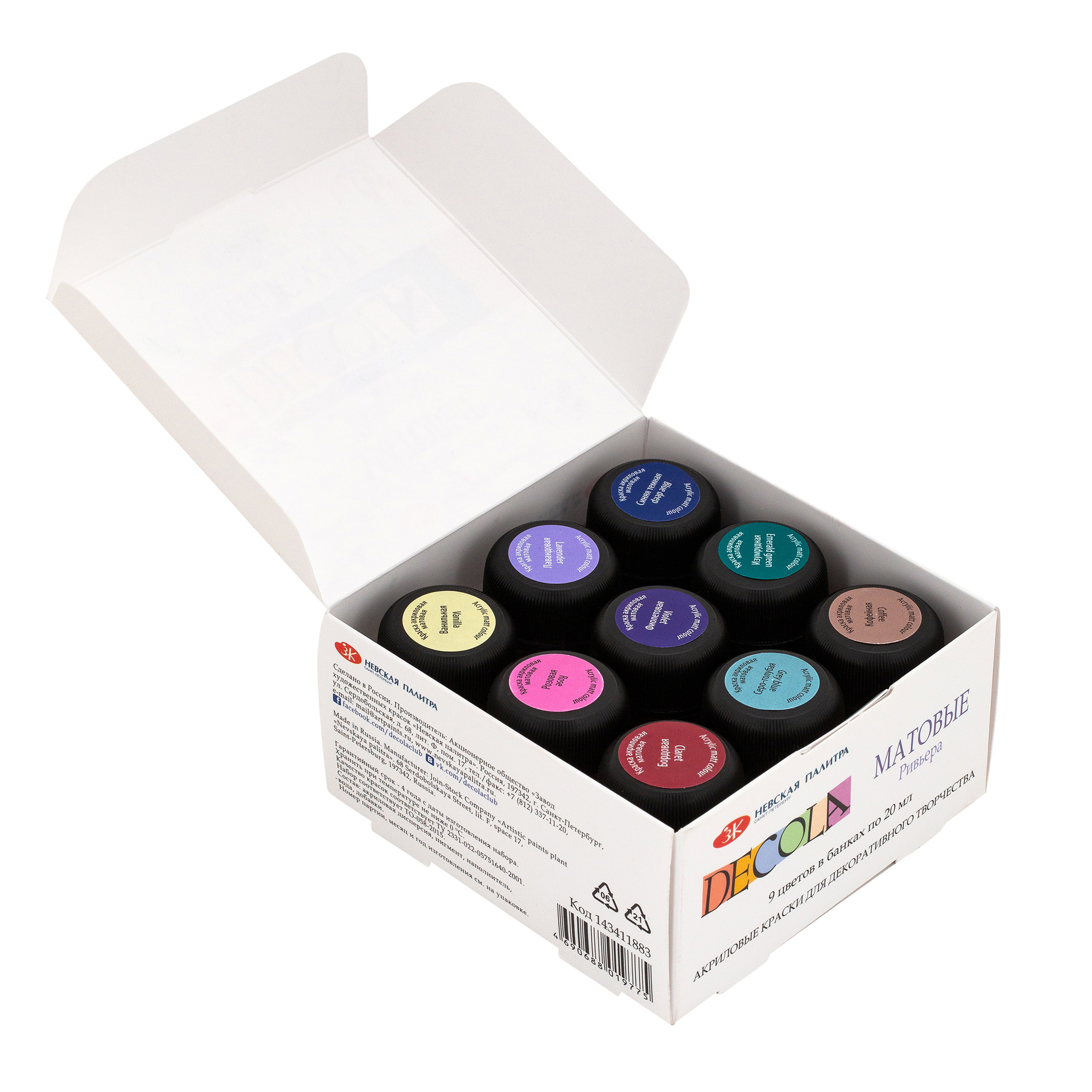 Акрил Decola изготовлен на основе водной акриловой дисперсии. Для достижения художественных эффектов краски можно использовать в сочетании с медиумами и различными добавками. Краски Decola подходят для работы на таких поверхностях, как: бумага, холст, дерево, металл, стекло, кожа. Все цвета хорошо смешиваются между собой и при необходимости разбавляются водой. После высыхания краска становится водостойкой и приобретает матовый эффект. В наборе 9 цветов. Состав набора и выкраски вы можете посмотреть в дополнительных фото. Акрил глянцевый Decola («Дек?ла») производится заводом художественных красок Невская палитра, расположенным в городе Санкт-Петербурге. Завод уже более 80 лет выпускает продукцию для профессиональных художников и любителей творчества.
