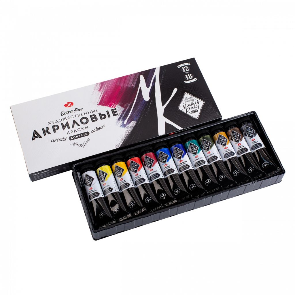Художественные акриловые краски серии «мастер-класс» разработаны специально для профессиональных художников, в них соединились традиции производства с инновационными разработками. Высокая насыщенность пигментов и минимальное содержание наполнителей позволяют сохранить блеск, интенсивность и глубину цвета после высыхания, а тщательно сбалансированная основа придает краске богатую текстуру и корпусность. Краски можно использовать как для традиционной живописи, так и для дизайнерских работ. Набор состоит из 12 цветов в тубах по 18 мл.