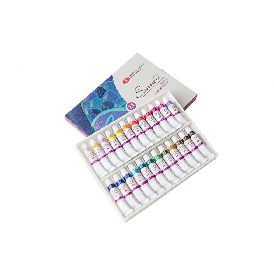 Акрил «Сонет» производится заводом художественных красок Невская палитра, расположенным в городе Санкт-Петербурге. Завод уже более 80 лет выпускает продукцию для профессиональных художников и любителей творчества. Акрил «Сонет» отличается яркостью и чистотой цвета. Краски этой серии универсальны в применении, они подойдут для художественных, декоративных, дизайнерских и других видов работ. За счет своей структуры краска хорошо ложится на различные поверхности: бумагу, кожу, картон, холст, дерево, металл. Все цвета смешиваются между собой. При высыхании образуется эластичная несмываемая пленка. Акрил «Сонет» представлен в серии из 35 цветов, в которой присутствуют серебро и золото. Краска выпускается в удобных пластиковых тубах по 75 миллилитров и в наборах различной комплектации.