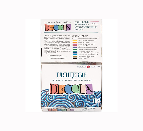 Акрил глянцевый «Decola» («Дек?ла») производится заводом художественных красок Невская палитра, расположенным в городе Санкт-Петербурге. Завод уже более 80 лет выпускает продукцию для профессиональных художников и любителей творчества. Акрил глянцевый «Decola» изготовлен на основе водной акриловой дисперсии. Для достижения художественных эффектов краски можно использовать в сочетании с медиумами и различными добавками. Краски «Decola» подходят для работы на таких поверхностях, как: бумага, холст, дерево, металл, стекло, кожа. Все цвета хорошо смешиваются между собой и при необходимости разбавляются водой. После высыхания краска становится водостойкой и приобретает глянцевый блеск. Палитра акрила глянцевого «Decola» постоянно расширяется, на сегодняшний день в ней представлено около 30 различных цветов, которые выпускаются поштучно в баночках по 50 миллилитров и в наборах различной комплектации.