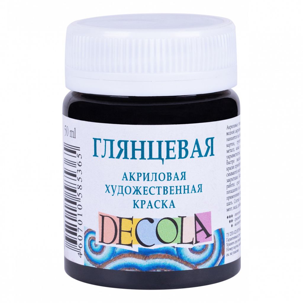 Акрил глянцевый Decola изготовлен на основе водной акриловой дисперсии. Для достижения художественных эффектов краски можно использовать в сочетании с медиумами и различными добавками. Краски Decola подходят для работы на таких поверхностях, как: бумага, холст, дерево, металл, стекло, кожа. Все цвета хорошо смешиваются между собой и при необходимости разбавляются водой. После высыхания краска становится водостойкой и приобретает глянцевый блеск. Палитра акрила глянцевого Decola постоянно расширяется, на сегодняшний день в ней представлено около 30 различных цветов, которые выпускаются поштучно в баночках по 50 и 100 миллилитров и в наборах различной комплектации. Акрил глянцевый Decola («Дек?ла») производится заводом художественных красок «Невская палитра», расположенным в городе Санкт-Петербурге. Завод уже более 80 лет выпускает продукцию для профессиональных художников и любителей творчества.