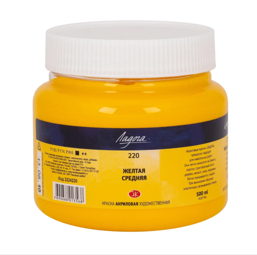 В палитре акриловых красок «Ладога» дорогие неорганические пигменты были заменены на ор и полностью соответствуют оригинальным цветам. Это сделало акрил «Ладога» более доступным для потребителя. Для удобства пользователя цвета, созданные с заменой пигментов, обозначены на этикетке буквой «А» . Художественные акриловые краски «Ладога» имеют универсальное применение, они прекрасно подойдут как для художественных работ, так и для декоративных и дизайнерских. Краски хорошо ложатся на многие поверхности: бумагу, кожу, картон, холст, дерево, металл. Все цвета смешиваются между собой. Преимуществом данной серии является то, что помимо основных цветов в палитре представлено 13 цветов металликов в тубах по 46 миллилитров. Основные цвета представлены в тубах по 46 миллилитров и в баночках объемом 100, 220 и 500 миллилитров. Также акрил «Ладога» выпускается в наборах различной комплектации. Акрил «Ладога» производится заводом художественных красок Невская палитра, расположенным в городе Санкт-Петербурге. Завод уже более 80 лет выпускает продукцию для профессиональных художников и любителей творчества.