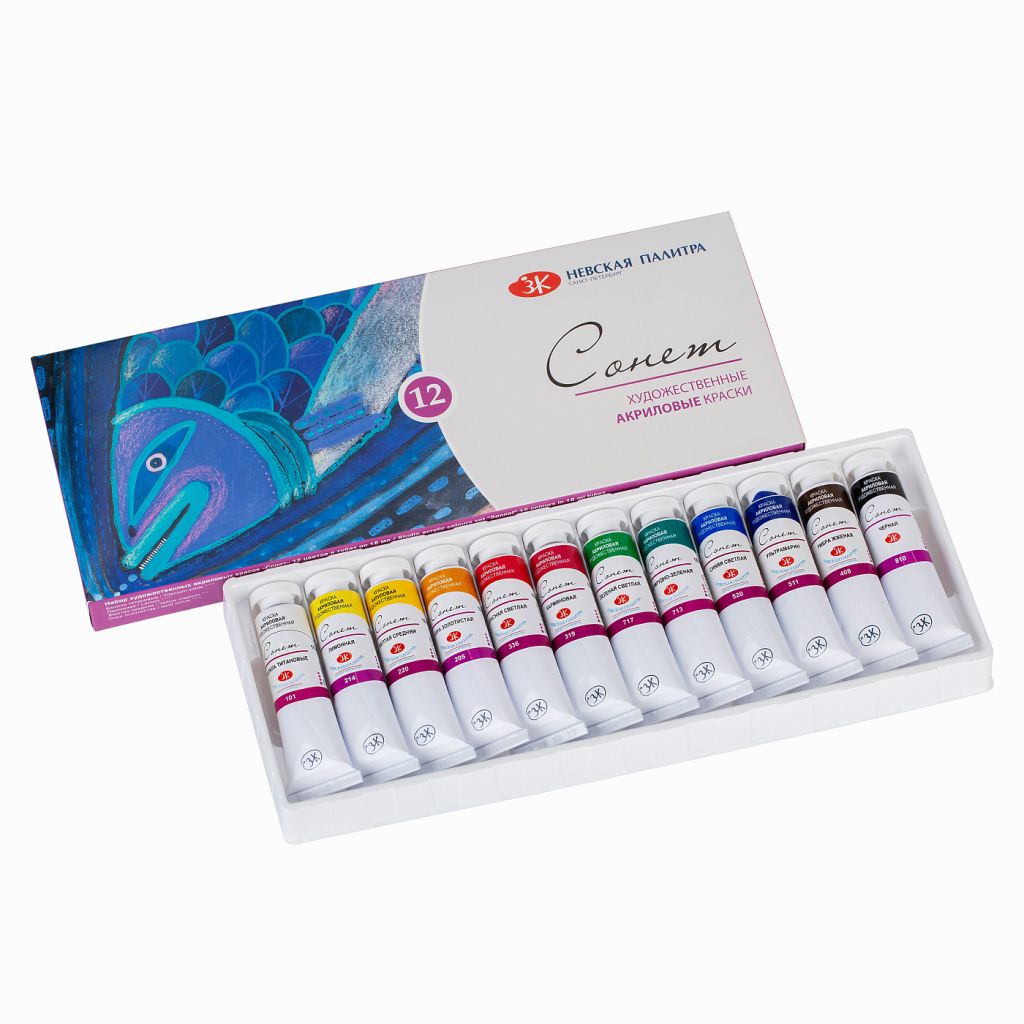 Акрил «Сонет» отличается яркостью и чистотой цвета. Краски этой серии универсальны в применении, они подойдут для художественных, декоративных, дизайнерских и других видов работ. За счет своей структуры краска хорошо ложится на различные поверхности: бумагу, кожу, картон, холст, дерево, металл. Все цвета смешиваются между собой. При высыхании образуется эластичная несмываемая пленка. Акрил «Сонет» производится заводом художественных красок Невская палитра, расположенным в городе Санкт-Петербурге. Завод уже более 80 лет выпускает продукцию для профессиональных художников и любителей творчества.