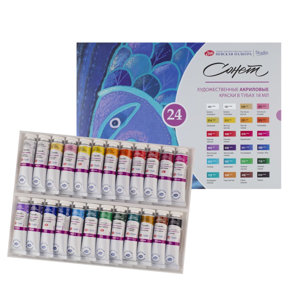 Акрил «Сонет» отличается яркостью и чистотой цвета. Краски этой серии универсальны в применении, они подойдут для художественных, декоративных, дизайнерских и других видов работ. За счет своей структуры краска хорошо ложится на различные поверхности: бумагу, кожу, картон, холст, дерево, металл. Все цвета смешиваются между собой. При высыхании образуется эластичная несмываемая пленка. Акрил «Сонет» производится заводом художественных красок Невская палитра, расположенным в городе Санкт-Петербурге. Завод уже более 80 лет выпускает продукцию для профессиональных художников и любителей творчества.