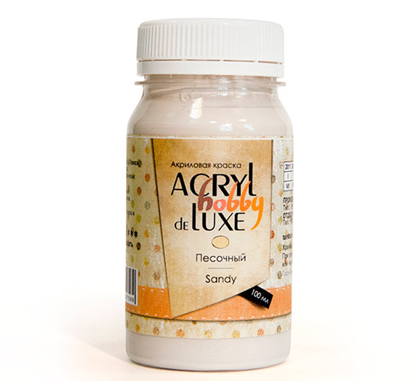 Акрил Hobby DeLuxe – краска на акриловой основе. Эта серия отличается от других большим количеством мягких пастельных оттенков и хорошей укрывистостью. Краска обладает слабовыраженным запахом, который исчезает при высыхании. Акрил Hobby DeLuxe хорошо подходит для декоративно-прикладных работ. Разбавляется водой или разбавителем акриловых красок. Красочный слой после высыхания становится водостойким и устойчивым к выцветанию. Hobby DeLuxe можно сочетать с другими акриловыми красками и акриловыми материалами (пасты, гели, различные добавки), что значительно расширяет художественные возможности. Акрил Hobby DeLuxe представлен палитрой из разнообразных пастельных оттенков. Все цвета выполнены с использованием 4-5 пигментов. Палитра цветов постоянно расширяется, и выпускаются новые оттенки. Акрил предлагается поштучно в баночках по 100 миллилитров. Акрил Hobby DeLuxe («Хобби Де Люкс») выпускается компанией «Таир», которая была основана в 1997 году в Санкт-Петербурге. Компания постоянно развивается и уже более 15 лет успешно работает на рынке художественных материалов.