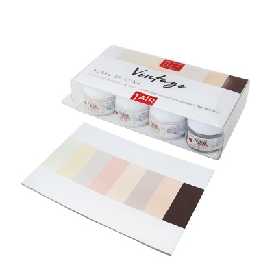 Краски «Акрил Де Люкс» — это акриловые краски приятной текучей консистенции, после высыхания образующие матовый слой. Палитра красок представлена нежными пастельными оттенками и существенно расширяет базовую цветовую гамму акриловых красок. Использовать «Акрил Де Люкс» для творчества можно и в качестве основной палитры, и как дополнение с другими акриловыми красками. Краски используются в живописи и декоративно-прикладном искусстве, они обладают высокой степенью укрывистости, не подвержены выцветанию. Преимущественно пастельная палитра, в сочетании со сложными глубокими оттенками потрясающе смотрятся в живописных работах. Красивая бархатистая поверхность, изысканные оттенки и возможность создавать плавные «акварельные» переходы — это только некоторые качества, за которые художники так любят эту линейку. Набор «Винтаж» — это комбинация гармоничных сдержанных оттенков. Преимущественно тёплая гамма пастельных, словно выцветших оттенков, навевает мысли о спокойном уюте старинного дома. Набор состоит из 8 баночек объёмом 20 мл. Широкое горлышко банки очень удобно для работы широкой кистью. Банки упакованы в прозрачную пластиковую коробку. Цвета в наборе: Слоновая кость Слоновая кость тёплая Песочный Персики в шампанском Кукольный телесный Устрично-бежевый Апельсиновый мусс Горький шоколад