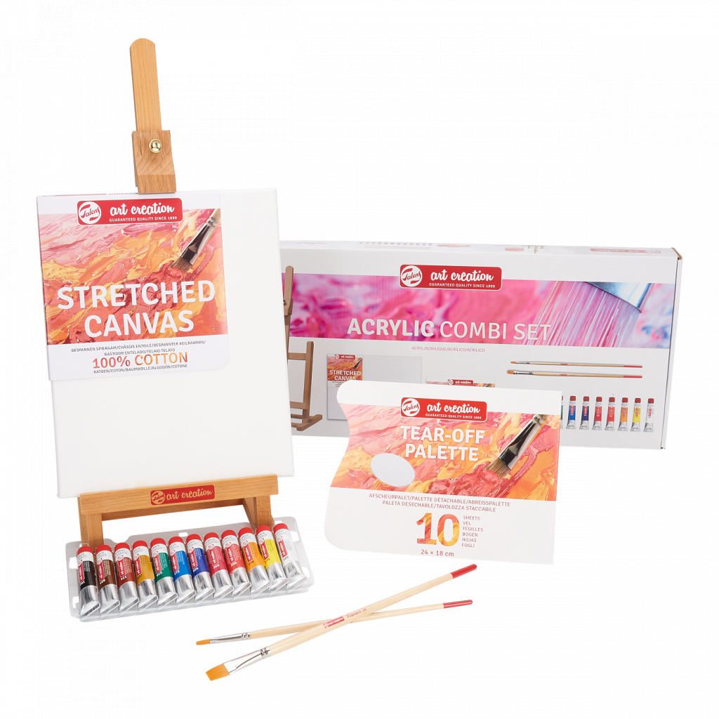 О серии: акриловые краски «Art Creation» - уникальные и современные краски, которые произведены из 100% акриловой смолы. Идеальны для начинающих художников. Серия красок представлена палитрой из 38 цветов. Представлены поштучно в тубах по 70 миллилитров, в банках по 750 миллилитров и в наборах различной комплектации. Производство: производится в городе Апелдорн голландской компанией «ROYAL TALENS», которую основал. Мартин Таленс (Marten Talens) в 1899 году. «ROYAL TALENS» производит все виды художественных красок и является одним из ведущих производителей в своей отрасли. Характеристика: краска имеет густую пастообразную структуру, при необходимости разводится водой. Быстросохнущая. После высыхания образует прочную несмываемую плёнку. Применение: краска предназначена для художественных, живописных и оформительских работ. Подходит для работы в пастозных техниках. Комплектация: в набор входит 12 туб по 12 миллилитров, настольный мольберт, холст 24*30, 2 кисти, бумажная палитра. Набор упакован в картонную коробку.