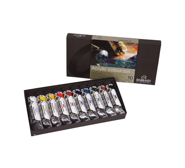 О серии: акриловые краски «Rembrandt» обладают высокой светостойкостью и плотной текстурой. Плотная краска для создания чётких мазков. Подходят для профессионального использования. Представлена в наборах различной комплектации. Производство: производится в городе Апелдорн голландской компанией «ROYAL TALENS», которую основал. Мартин Таленс (Marten Talens) в 1899 году. «ROYAL TALENS» производит все виды художественных красок и является одним из ведущих производителей в своей отрасли. Характеристика: краска имеет плотную текстуру. Яркие и насыщенные цвета с максимальной светостойкостью. После высыхания образует плотную плёнку. Применение: краска предназначена для художественных и живописных работ. Комплектация: в наборе 10 туб с краской по 40 миллилитров. Набор упакован в картонную коробку.