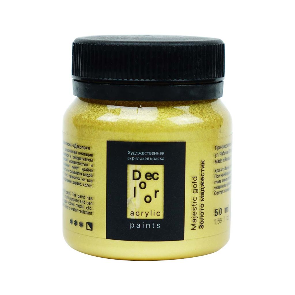 Акрил ДЕКОЛОР выпускается компанией «Таир», которая была основана в 1997 году в Санкт-Петербурге. Компания постоянно развивается и уже более 15 лет успешно работает на рынке художественных материалов. Акрил ДЕКОЛОР – смесь полиакрилатов и пигментов, вододисперсная вязкотекучая художественная краска. В серию красок ДЕКОЛОР вошли перламутровые и металлические оттенки. Краски хорошо ложатся на картон, древесину, гипс, камень, бетон и керамику. После высыхания образуют эластичную долговечную пленку, которая устойчива к воде и внешним воздействиям. Акрил ДЕКОЛОР может использоваться не только в декоративных и художественных целях, но и в реставрационных работах. Акрил ДЕКОЛОР представлен палитрой более 40 цветов, которые выпускаются поштучно в банках объемом по 50 и 100 миллилитров. Дизайн упаковки и этикетки товара может отличаться в зависимости от поставки.