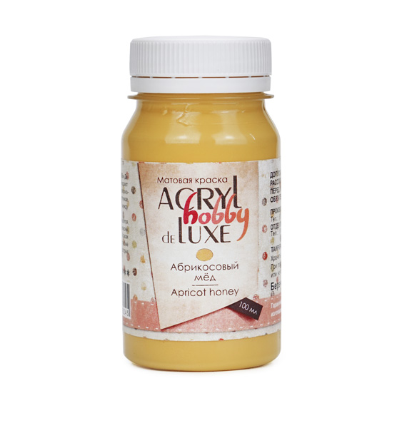 Акрил Hobby DeLuxe – краска на акриловой основе. Эта серия отличается от других большим количеством мягких пастельных оттенков и хорошей укрывистостью. Краска обладает слабовыраженным запахом, который исчезает при высыхании. Акрил Hobby DeLuxe хорошо подходит для декоративно-прикладных работ. Разбавляется водой или разбавителем акриловых красок. Красочный слой после высыхания становится водостойким и устойчивым к выцветанию. Hobby DeLuxe можно сочетать с другими акриловыми красками и акриловыми материалами (пасты, гели, различные добавки), что значительно расширяет художественные возможности. Акрил Hobby DeLuxe представлен палитрой из разнообразных пастельных оттенков. Все цвета выполнены с использованием 4-5 пигментов. Палитра цветов постоянно расширяется, и выпускаются новые оттенки. Акрил предлагается поштучно в баночках по 100 миллилитров. Акрил Hobby DeLuxe («Хобби Де Люкс») выпускается компанией «Таир», которая была основана в 1997 году в Санкт-Петербурге. Компания постоянно развивается и уже более 15 лет успешно работает на рынке художественных материалов.