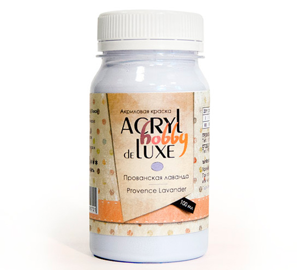 Акрил Hobby DeLuxe – краска на акриловой основе. Эта серия отличается от других большим количеством мягких пастельных оттенков и хорошей укрывистостью. Краска обладает слабовыраженным запахом, который исчезает при высыхании. Акрил Hobby DeLuxe хорошо подходит для декоративно-прикладных работ. Разбавляется водой или разбавителем акриловых красок. Красочный слой после высыхания становится водостойким и устойчивым к выцветанию. Hobby DeLuxe можно сочетать с другими акриловыми красками и акриловыми материалами (пасты, гели, различные добавки), что значительно расширяет художественные возможности. Акрил Hobby DeLuxe представлен палитрой из разнообразных пастельных оттенков. Все цвета выполнены с использованием 4-5 пигментов. Палитра цветов постоянно расширяется, и выпускаются новые оттенки. Акрил предлагается поштучно в баночках по 100 миллилитров. Акрил Hobby DeLuxe («Хобби Де Люкс») выпускается компанией «Таир», которая была основана в 1997 году в Санкт-Петербурге. Компания постоянно развивается и уже более 15 лет успешно работает на рынке художественных материалов.