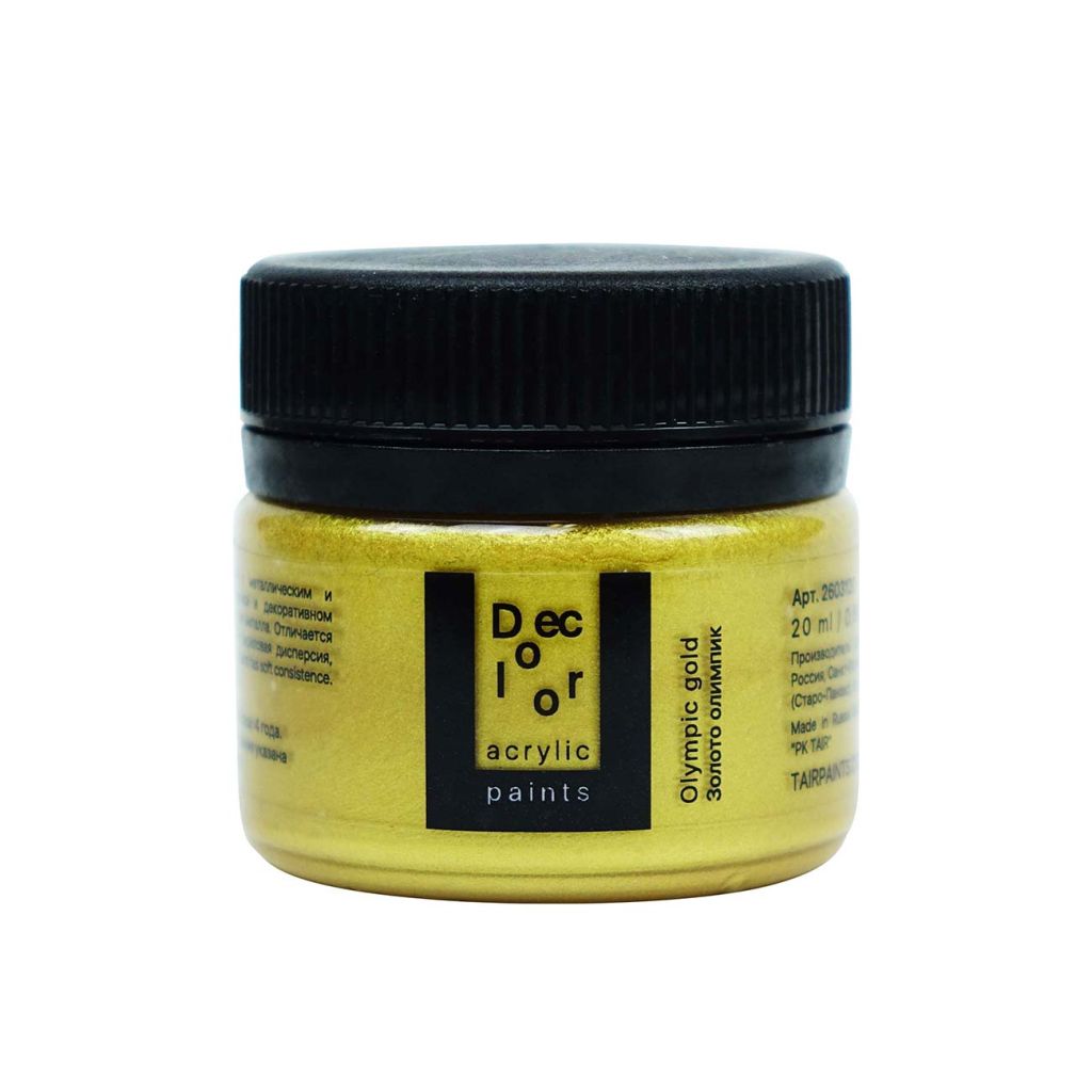 Художественные акриловые краски «Деколор» используются для имитации поверхности различных металлов. По консистенции — густые, приближенные к масляным краскам. Используются в живописных и декоративных техниках. Прекрасно подходят для объёмной живописи благодаря своим характеристикам и консистенции, а также успешно используются в техниках «сухой кисти», нанесении через трафарет, золочении элементов и т.д. Декоративные акриловые краски «Хамелеон» обладают перламутровым эффектом и прекрасно подходят для декора на любых поверхностях. Это полупрозрачная краска на акриловой основе, содержащая интерференционные пигменты. Интересный радужный эффект, который особенно заметен на тёмном фоне, можно использовать поверх нанесённого изображения в живописи, декупаже или любой другой технике. Консистенция: густая. Укрывистость: средняя. Состав: акриловая дисперсия, слюдяные пигменты, наполнитель, загуститель, консерванты, вода. Все цвета выполнены с использованием 4-5 пигментов. Свойства: ·Имеют эластичный и механически прочный красочный слой; ·Разбавляется водой, акриловым лаком, разбавителем акриловых красок и т.п.; ·После высыхания приобретает водостойкость; ·Устойчивы к атмосферному воздействию, не изменяют цвет в течение 10 лет; ·Хорошая сцепляемость с поверхностью; ·Время высыхания в течение одного часа; ·Смешиваются между собой в любых соотношениях для получения промежуточных оттенков; ·Не содержат металлов, не окисляются.
